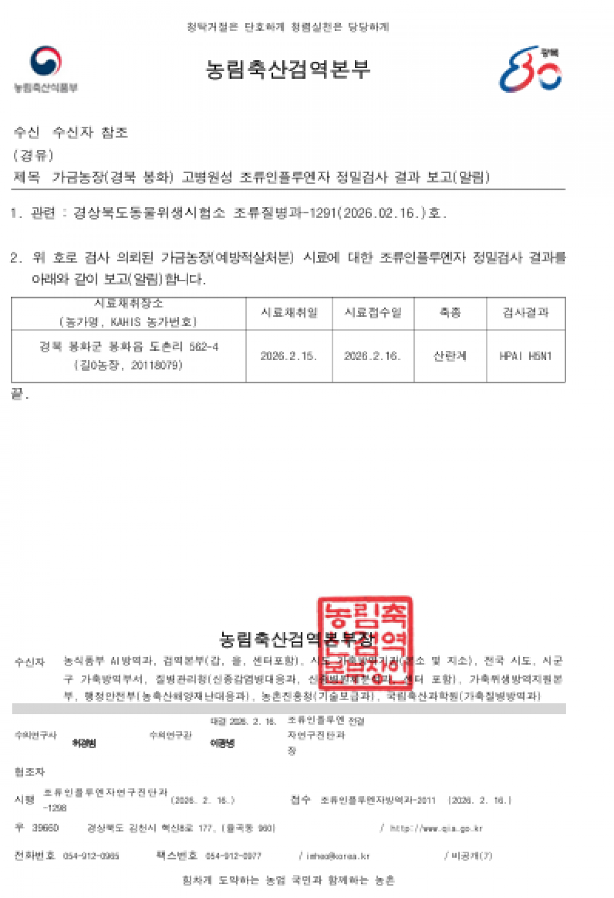 경북 봉화 예방적 살처분 가금농장(산란계) 고병원성 조류인플루엔자(AI) 확진에 따른 방역조치 알림