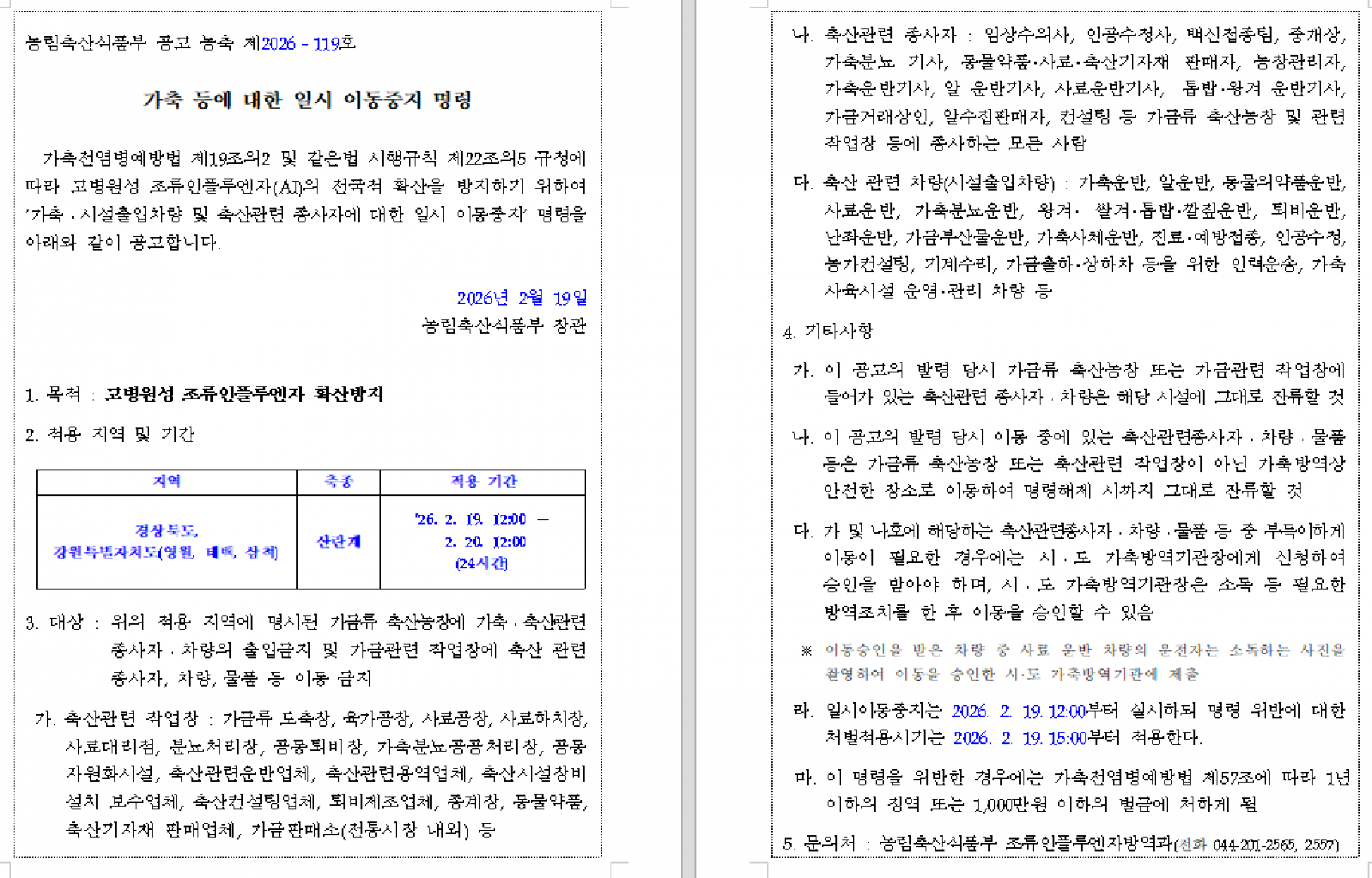 가축(산란계) 등에 대한 일시 이동중지(Standstill) 명령 발령 알림