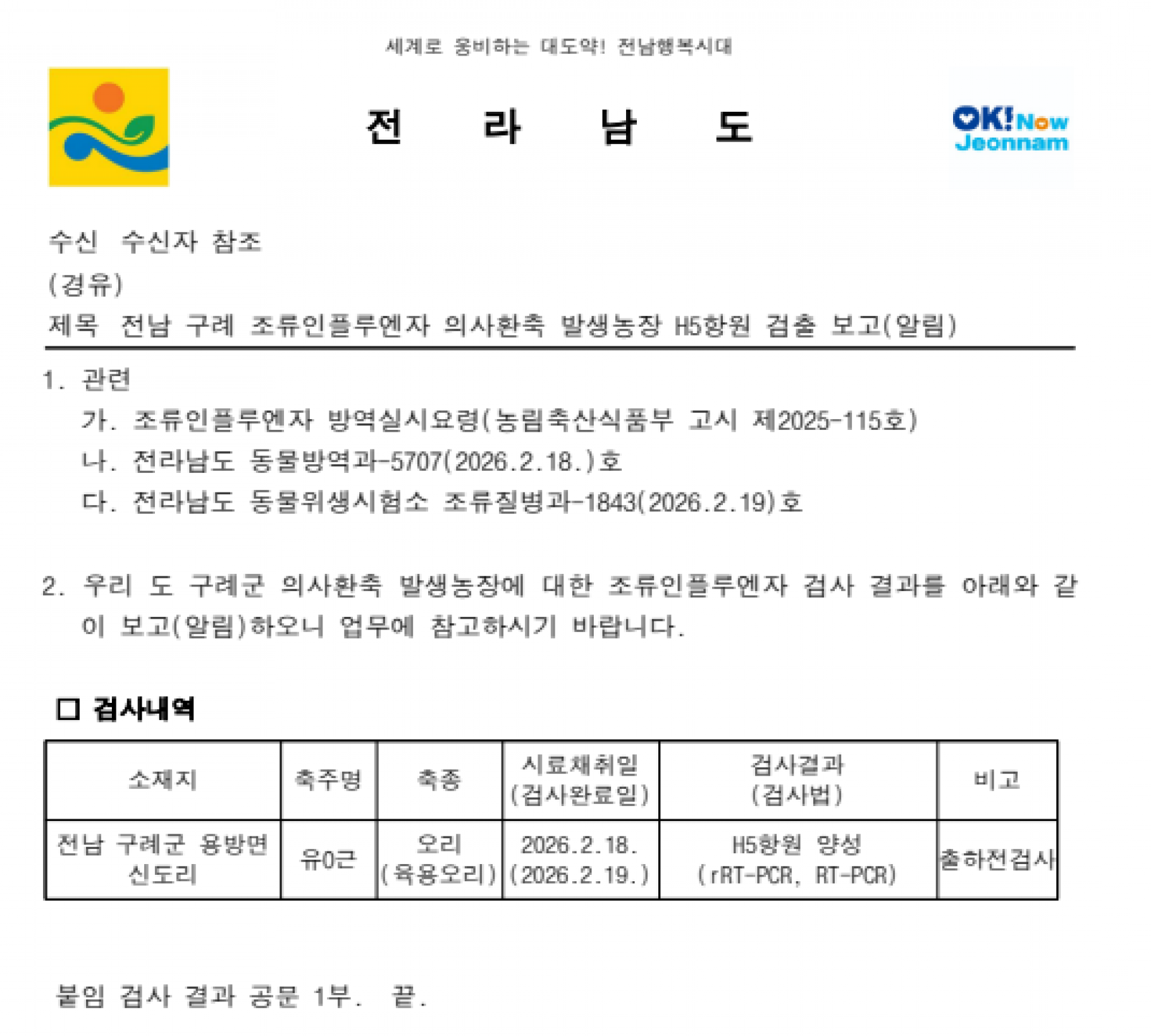 전남 구례 가금농장(육용오리) 고병원성 AI 의사환축 발생에 따른 방역강화 조치 |