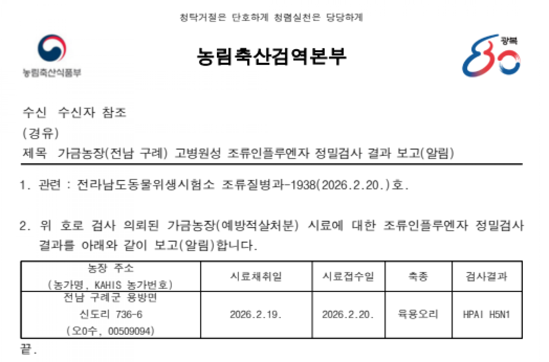 전남 구례 예방적 살처분 가금농장(육용오리) 고병원성 조류인플루엔자(AI) 확진에 따른 방역조치 알림