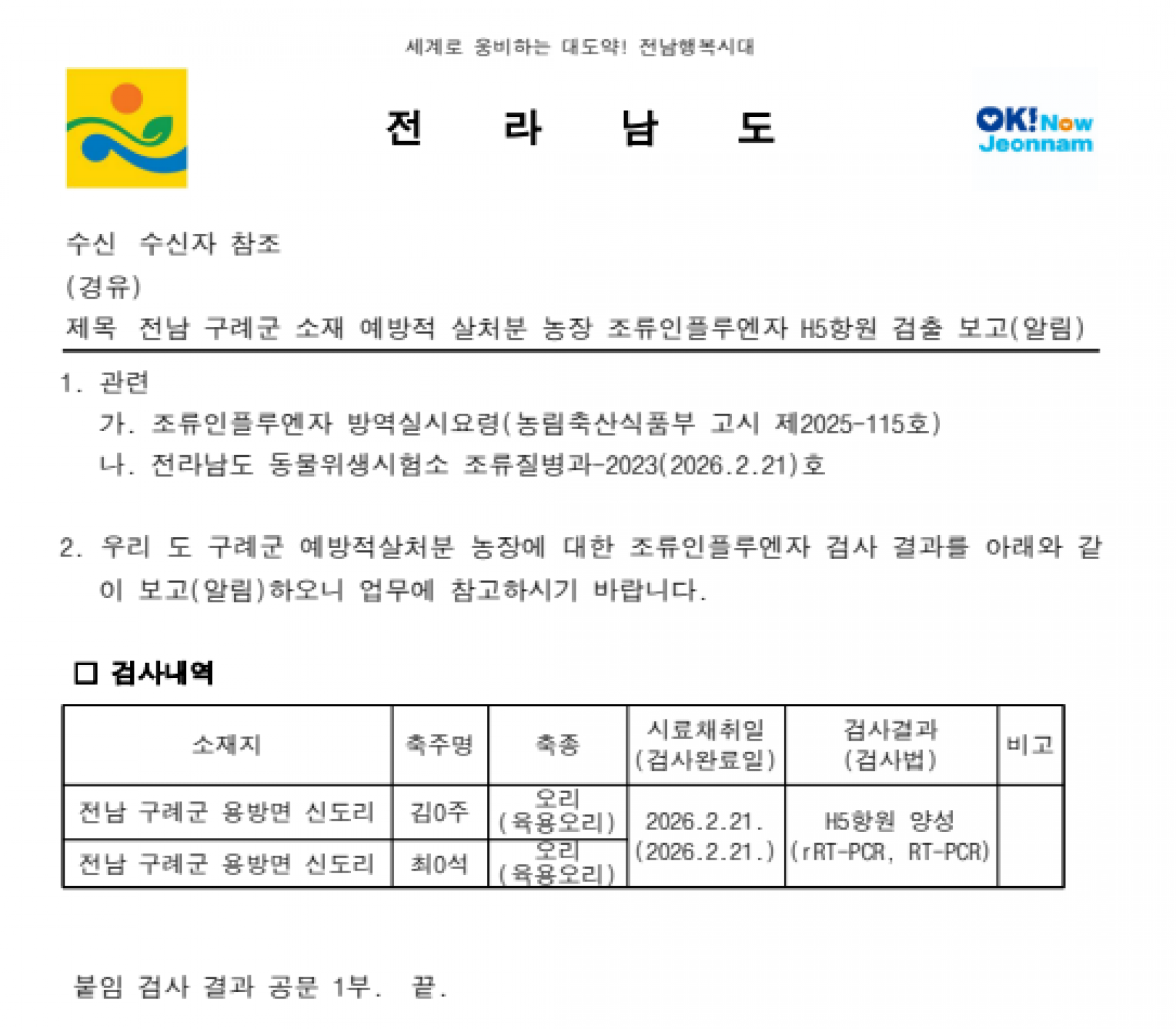 전남 구례 예방적 살처분 가금농장(육용오리) 고병원성 AI 의사환축 발생에 따른 방역강화 조치