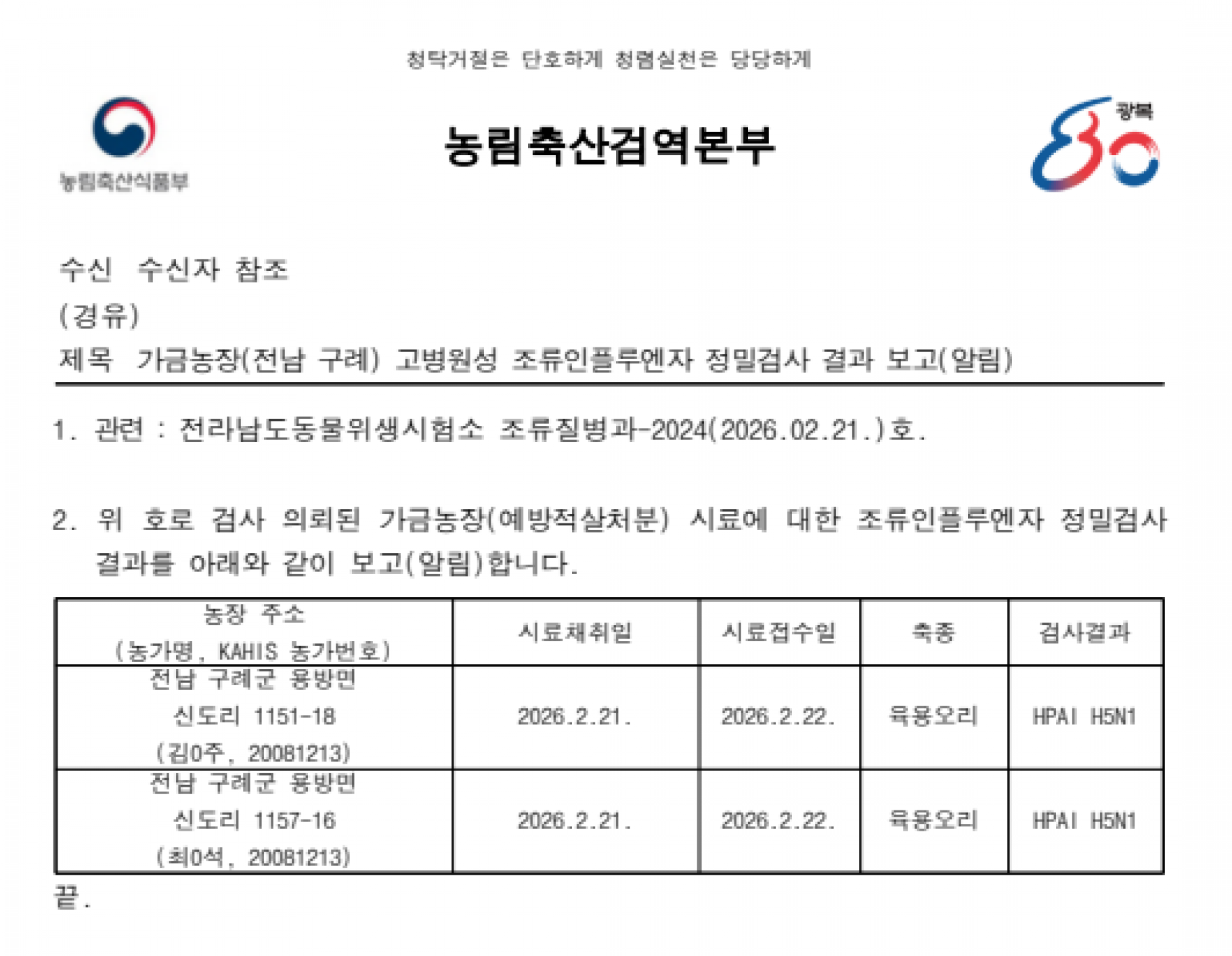 전남 구례 예방적 살처분 가금농장(육용오리) 고병원성 조류인플루엔자(AI) 확진에 따른 방역조치 알림 |