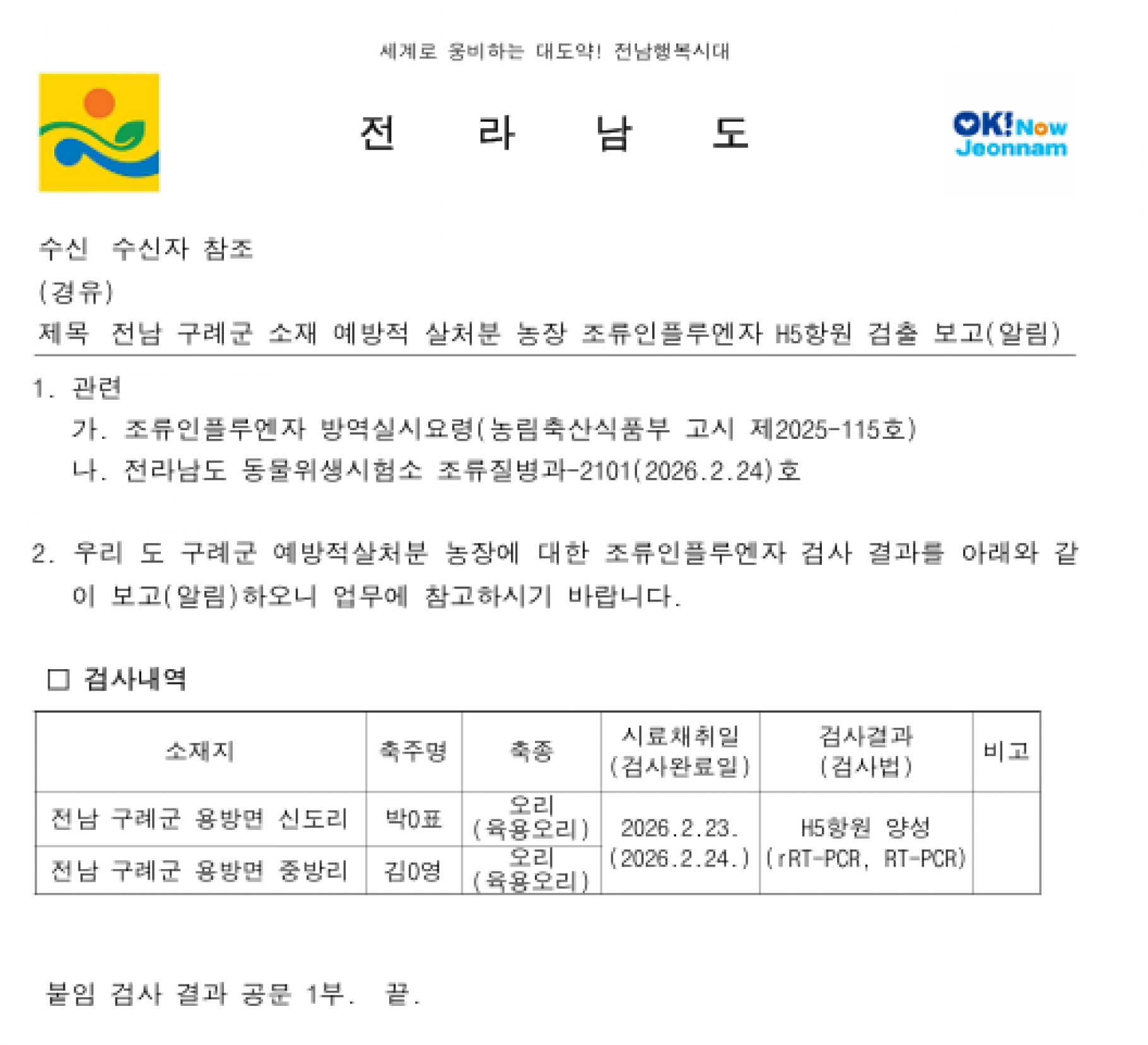 전남 구례 예방적 살처분 가금농장(육용오리) 고병원성 AI 의사환축 발생에 따른 방역강화 조치