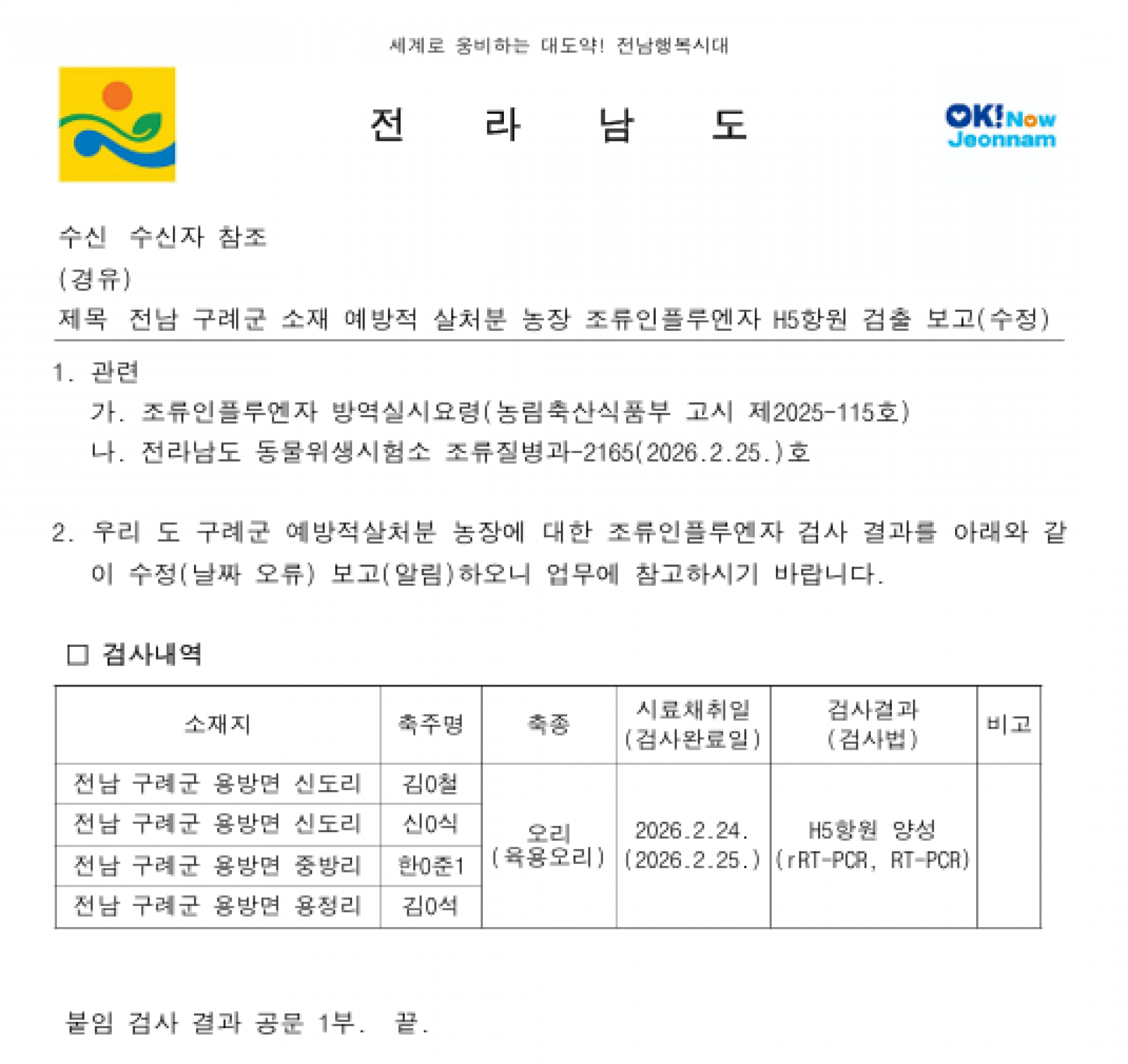 전남 구례 예방적 살처분 가금농장(육용오리) 고병원성 AI 의사환축 발생에 따른 방역강화 조치