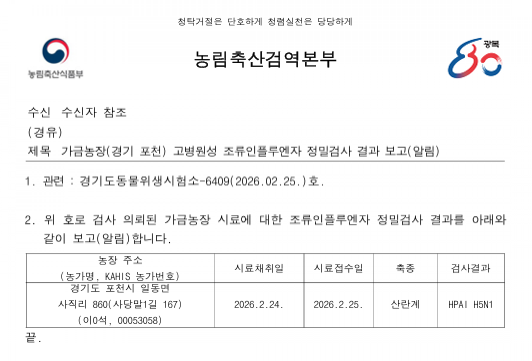 경기 포천 가금농장(산란계) 고병원성 조류인플루엔자(AI) 확진에 따른 방역조치 알림