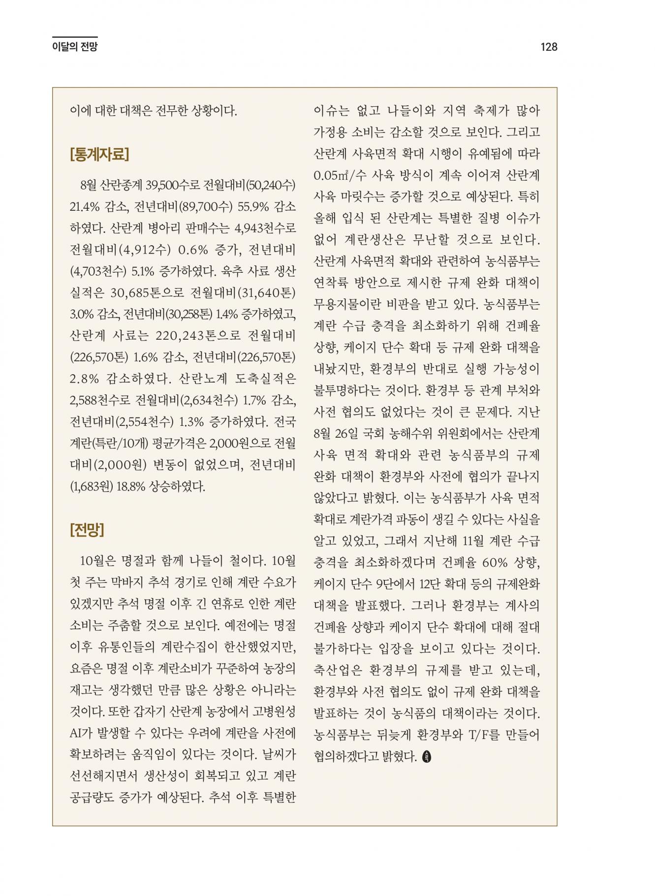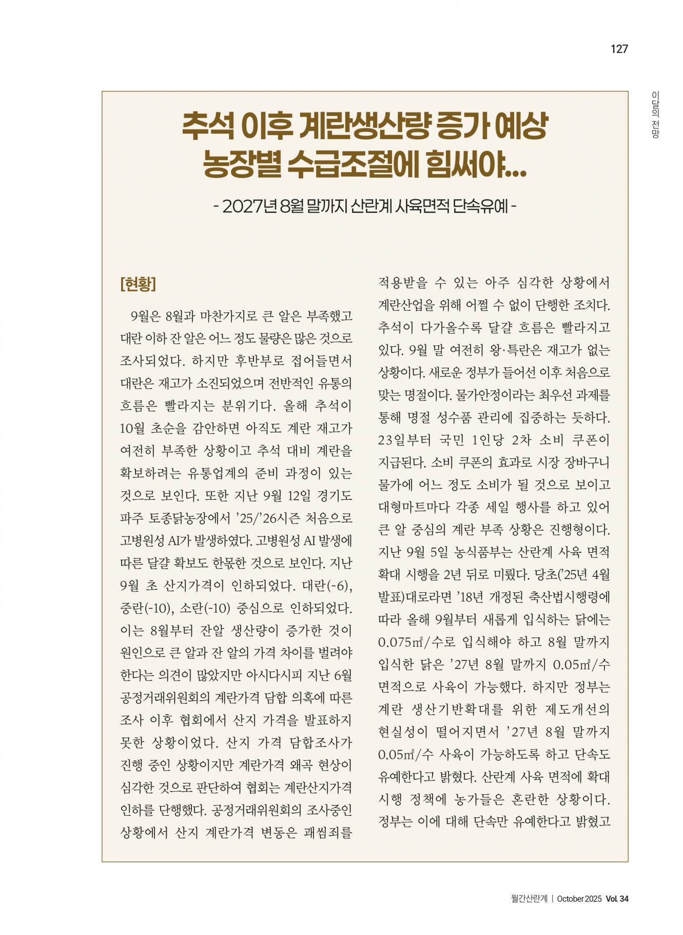 [이달의 전망] 추석 이후 계란생산량 증가 예상 농장별 수급조절에 힘써야...
