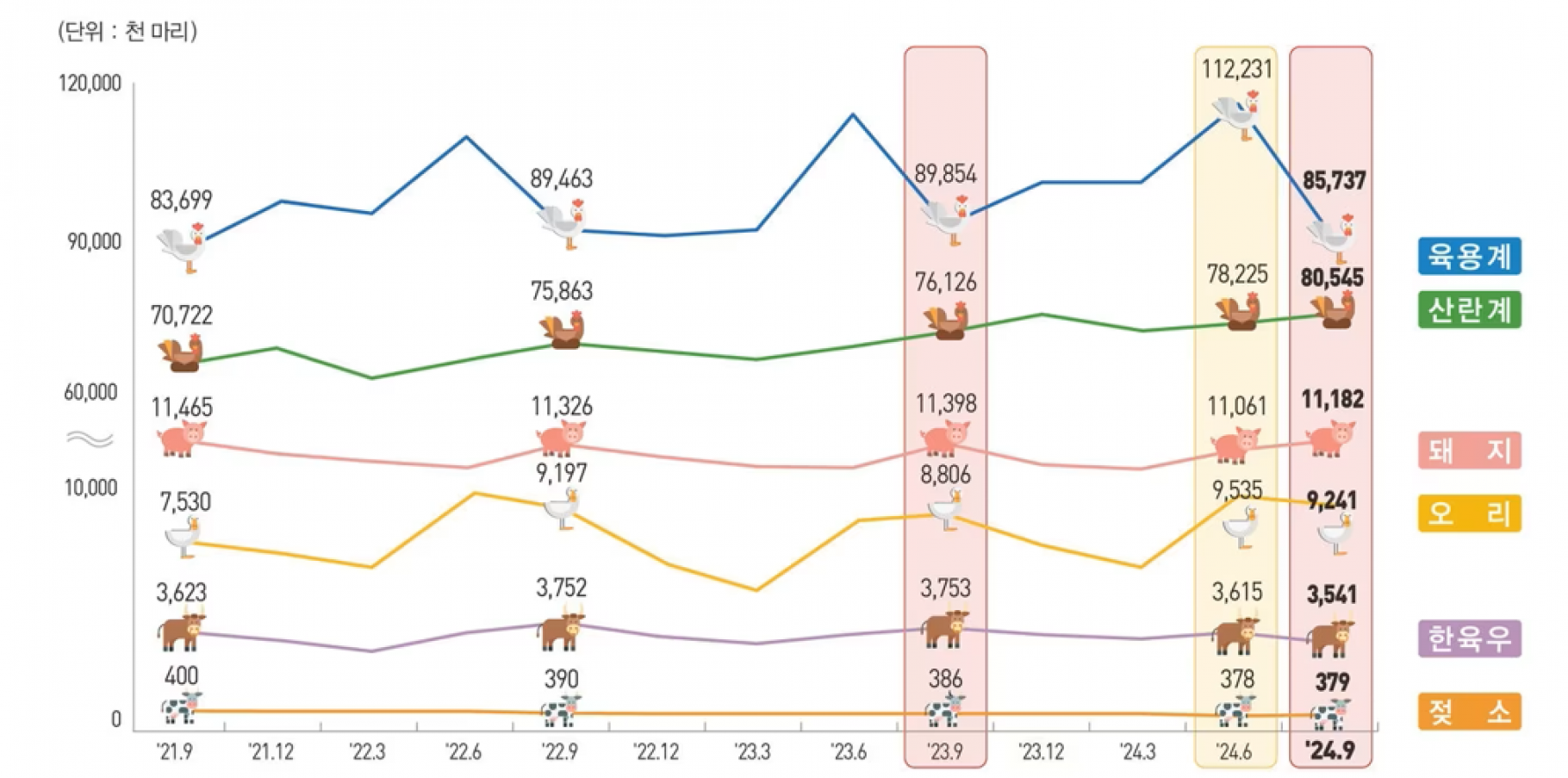 (세종=뉴스1) 전민 기자 = 지난 3분기 산란계와 오리 사육 마릿수는 전년보다 늘었으나, 한우, 젖소, 돼지, 육용계는 감소한 것으로 나타났다.