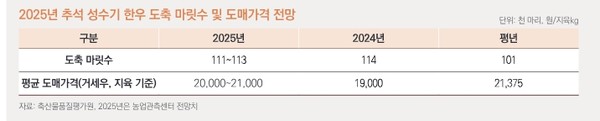 추석을 앞두고 9월 돼지 지육가격이 지난해 대비 3~7% 상승한 가운데 지난해 보다 늦은 추석으로 작업일수가 증가해 도축 마릿수는 늘어날 것으로 예상되고 있다.