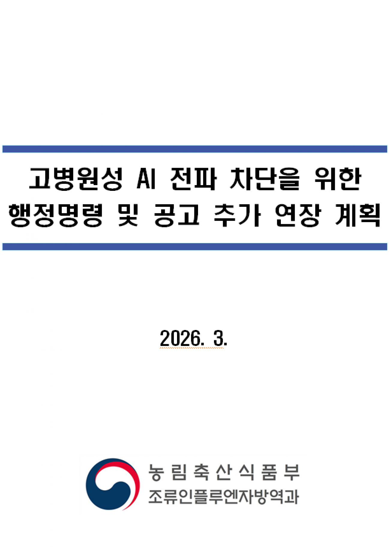 | 260331 AI 방역관리방안_송부용.hwpx 260331 고병원성 AI 전파 차단을 위한 행정명령 및 공고 추가 연장 계획_송부용.hwpx | |||