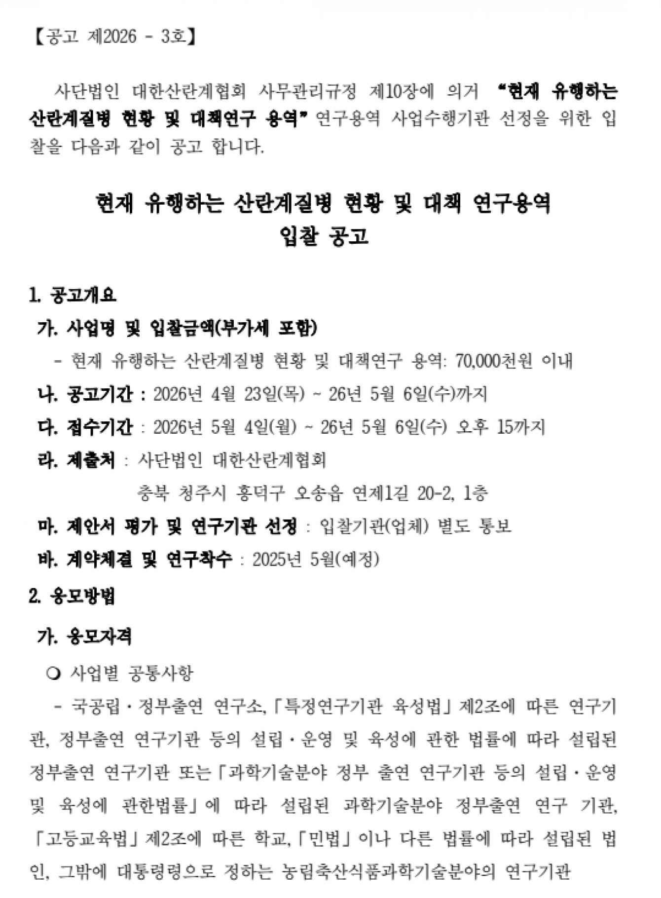 | (별첨1) 현재 유행하는 산란계질병 현황 및 대책연구 입찰제안서.hwp (별첨2) 2026년 대한산란계협회 조사연구_원가계산 및 정산기준.hwp 현재 유행하는 산란계질병 현황 및 대책연구 공고문.pdf | |||