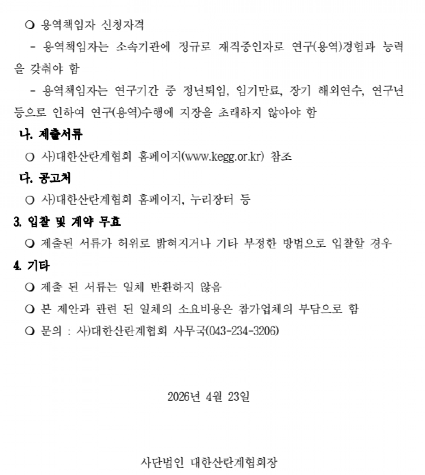 | (별첨1) 해외 산란계 및 계란 유통 실태와 경쟁력 비교 조사 연구 입찰제안서.hwp (별첨2) 2026년 대한산란계협회 조사연구_원가계산 및 정산기준.hwp 해외 산란계 및 계란 유통 실태와 경쟁력 비교 조사 연구 공고문.pdf | |||