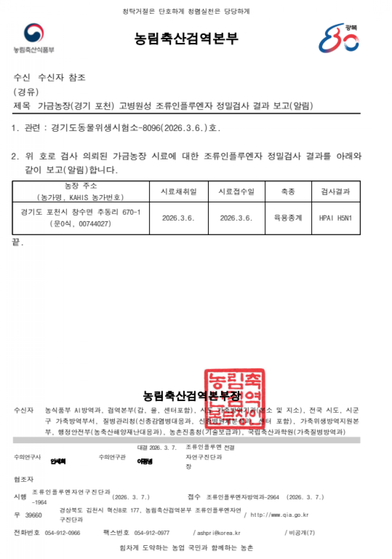 경기 포천 가금농장(육용종계) 고병원성 조류인플루엔자(AI) 확진에 따른 방역조치 알림
