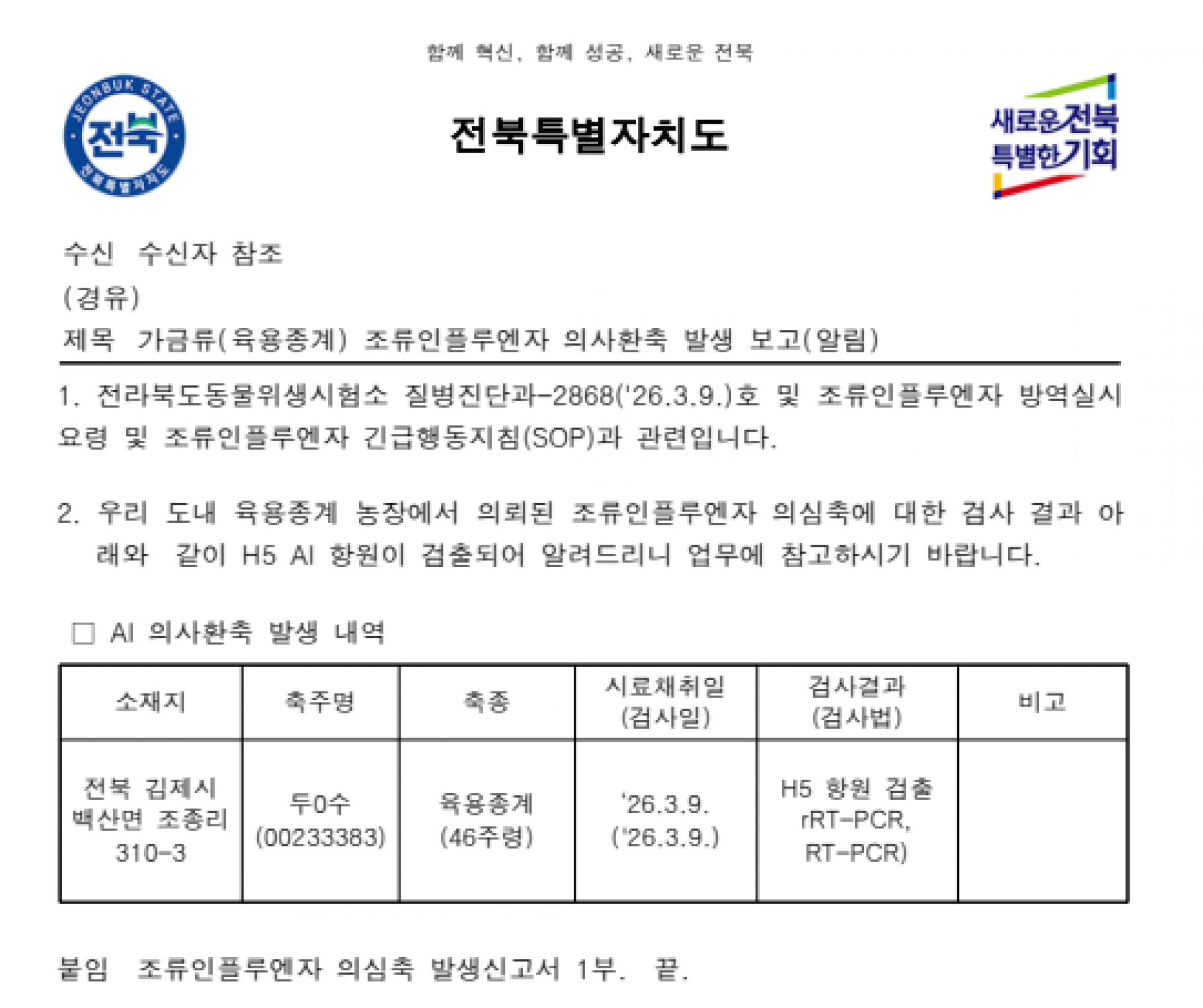 전북 김제 가금농장(육용종계) 고병원성 AI 의사환축 발생에 따른 방역강화 조치