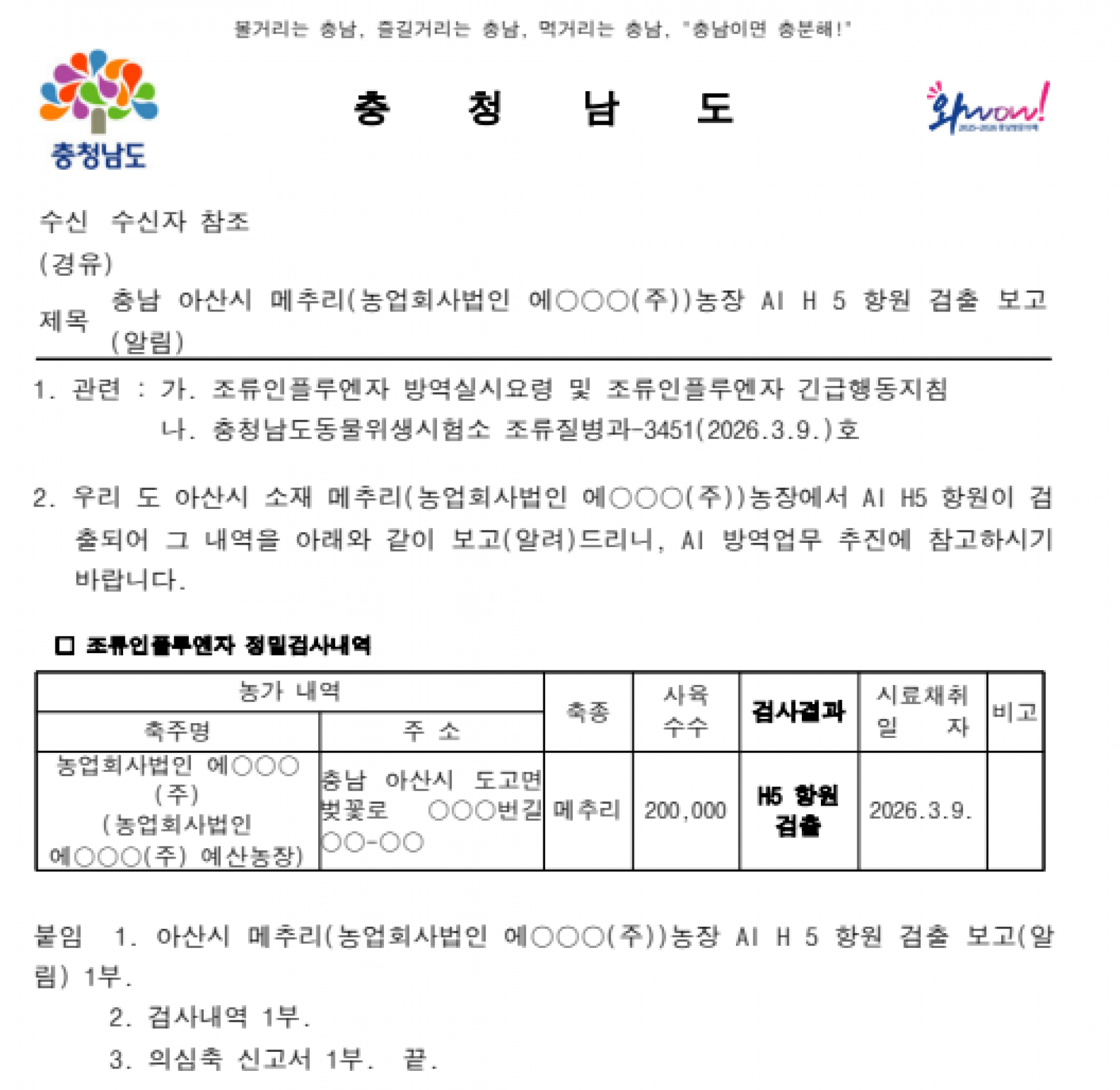 충남 아산 가금농장(메추리) 고병원성 AI 의사환축 발생에 따른 방역강화 조치