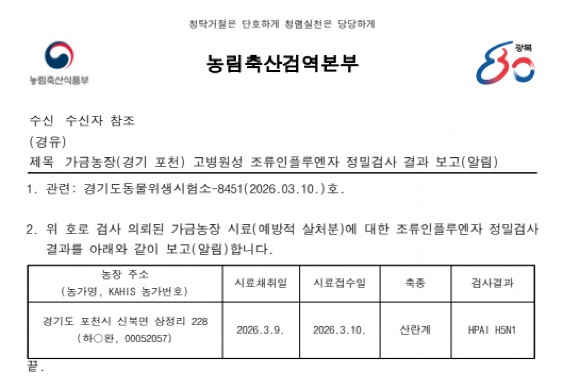 경기 포천 예방적 살처분 가금농장(산란계) 고병원성 조류인플루엔자(AI) 확진에 따른 방역조치 알림
