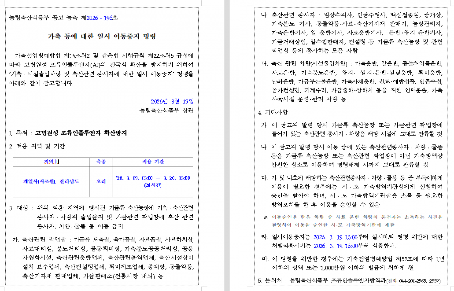가축(오리) 등에 대한 일시 이동중지(Standstill) 명령 발령 알림