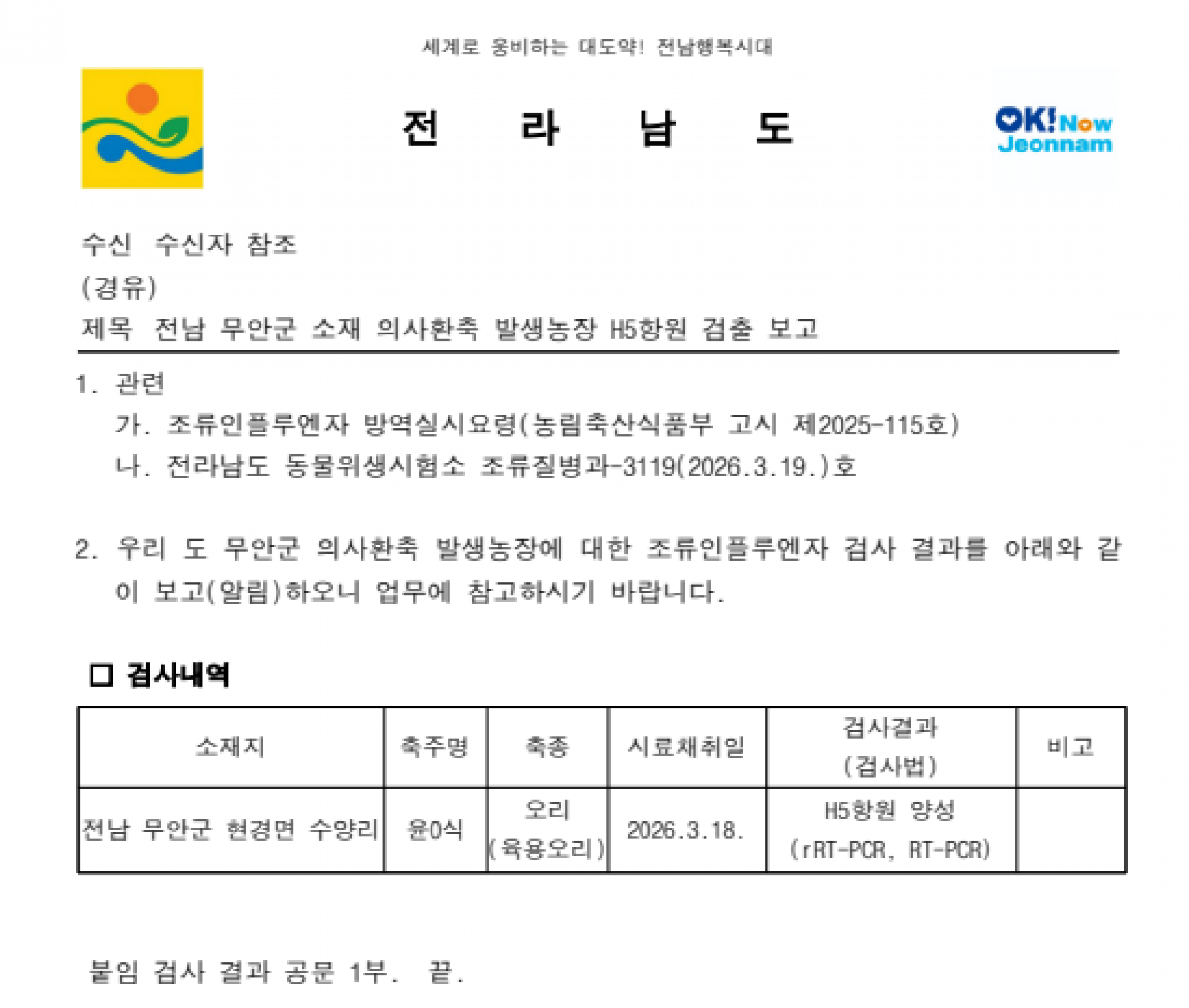 전남 무안 가금농장(육용오리) 고병원성 AI 의사환축 발생에 따른 방역강화 조치 |