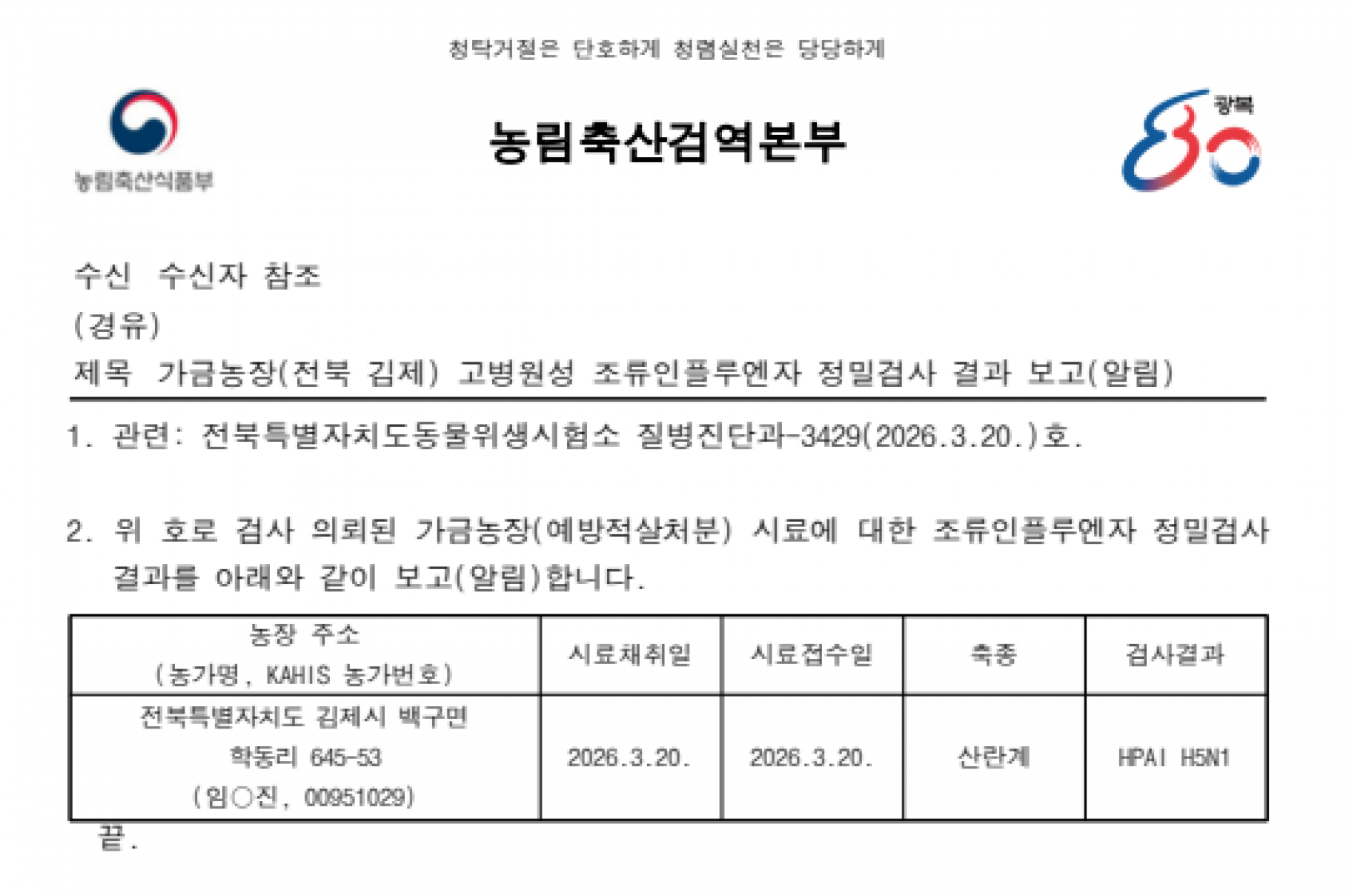 전북 김제 예방적 살처분 가금농장(산란계) 고병원성 조류인플루엔자(AI) 확진에 따른 방역조치 알림