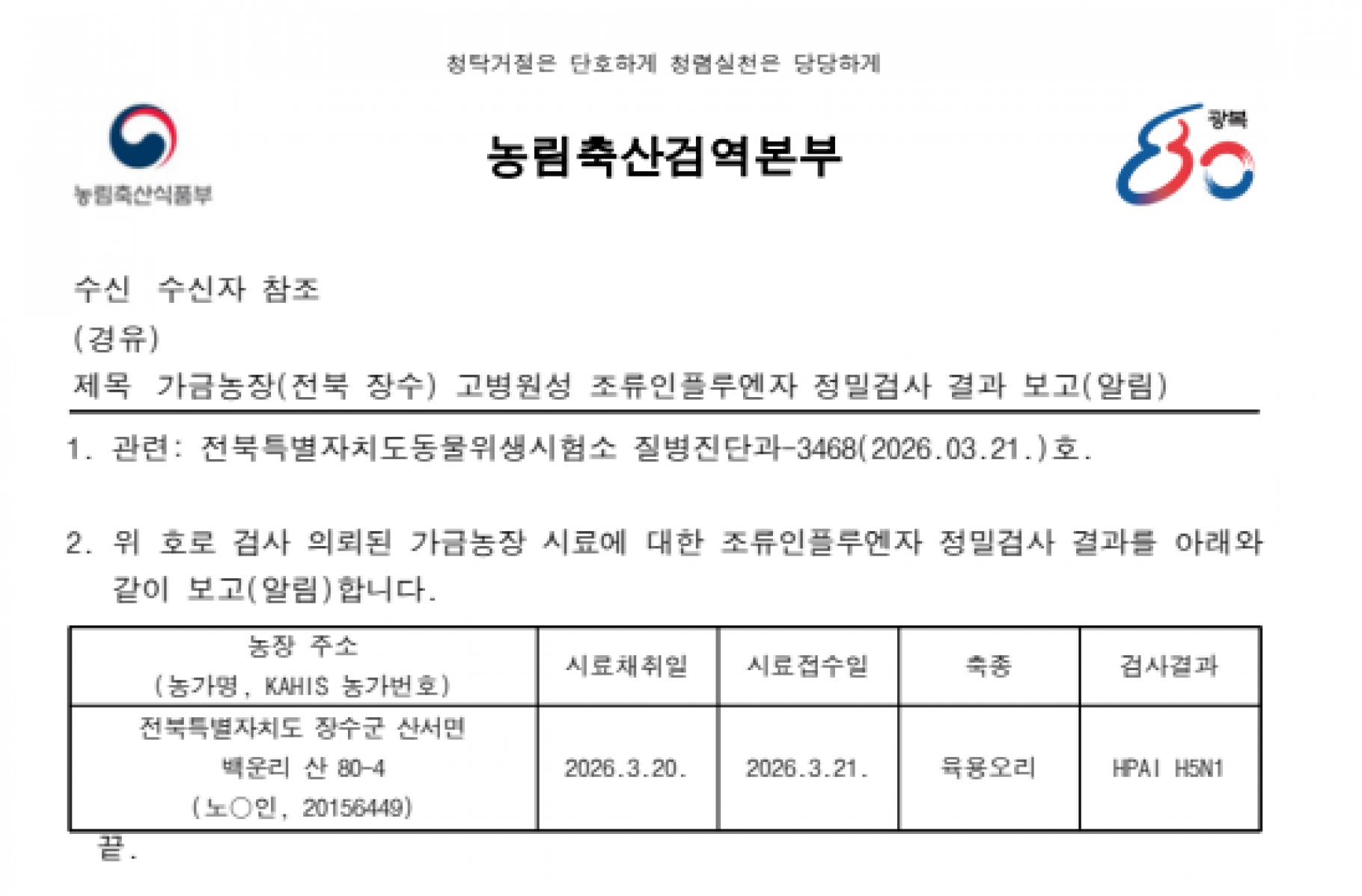 전북 장수 가금농장(육용오리) 고병원성 조류인플루엔자(AI) 확진에 따른 방역조치 알림