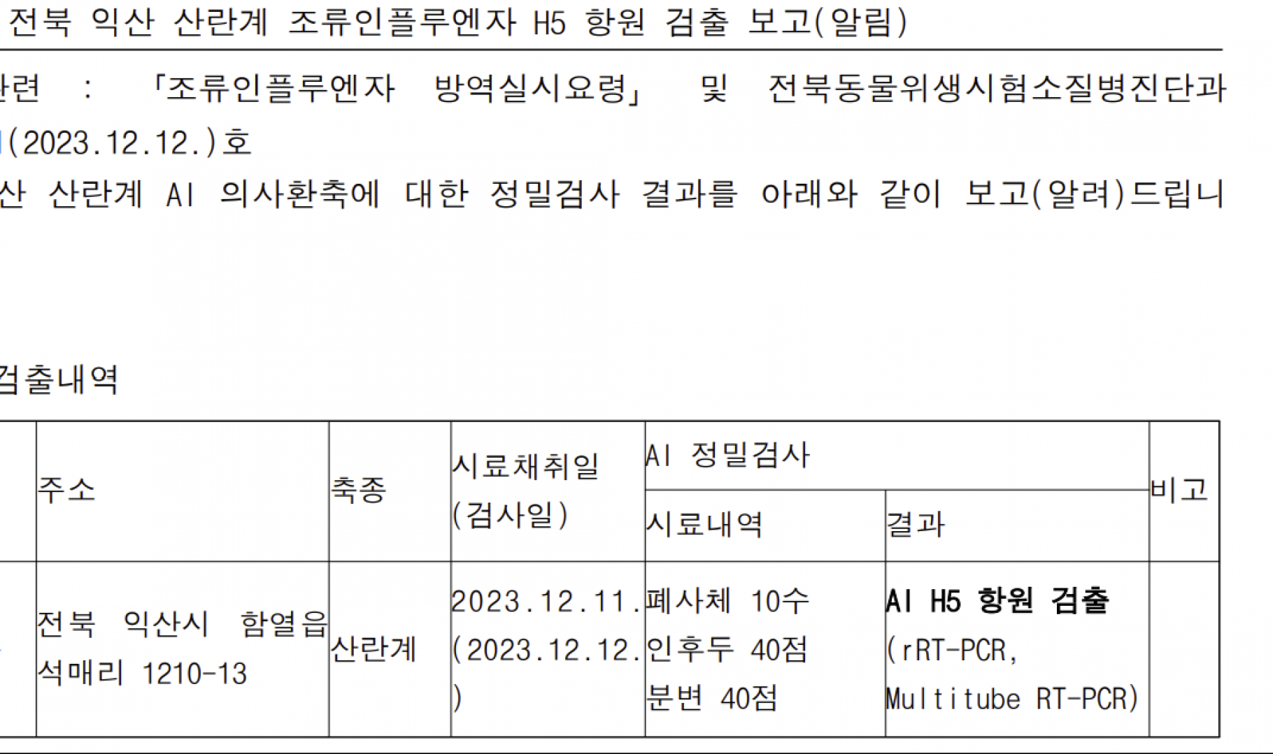 전북 익산시 소재 가금농장(산란계)에서 고병원성 AI의사환축(H5형)이 확인됨에 따라 차단방역 강화 조치사항을 붙임파일과 같이 알려드리니 농가에서는 농장방역에 만전을 기해주시기 바랍니다.![]()