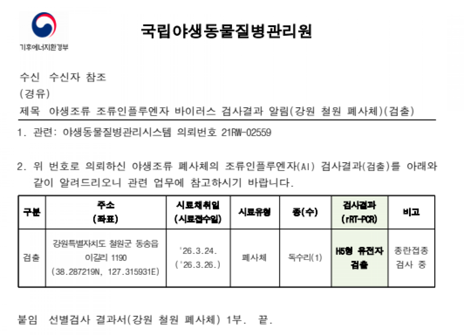 야생조류 조류인플루엔자(H5) 항원 검출에 따른 차단방역 및 예찰 강화 알림