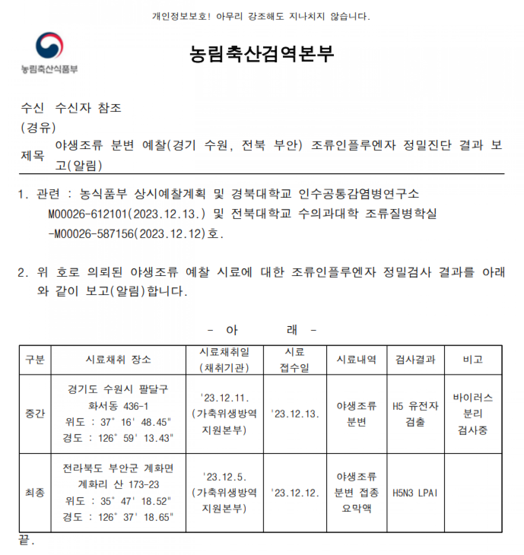 (경기 수원, 전북 부안) 야생조류 분변 예찰 조류인플루엔자 정밀 진단 결과 보고