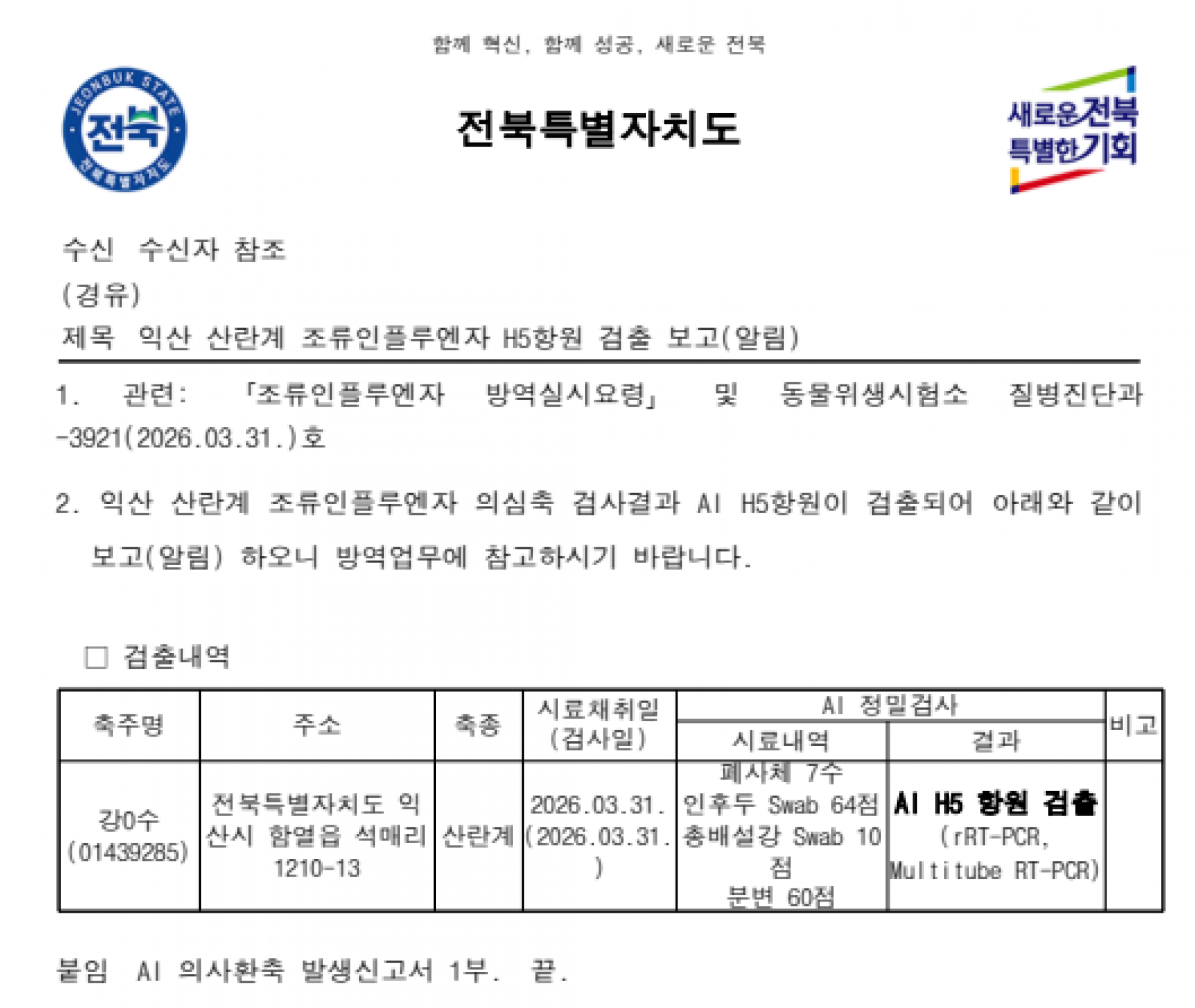 전북 익산 가금농장(산란계) 고병원성 AI 의사환축 발생에 따른 방역강화 조치 |