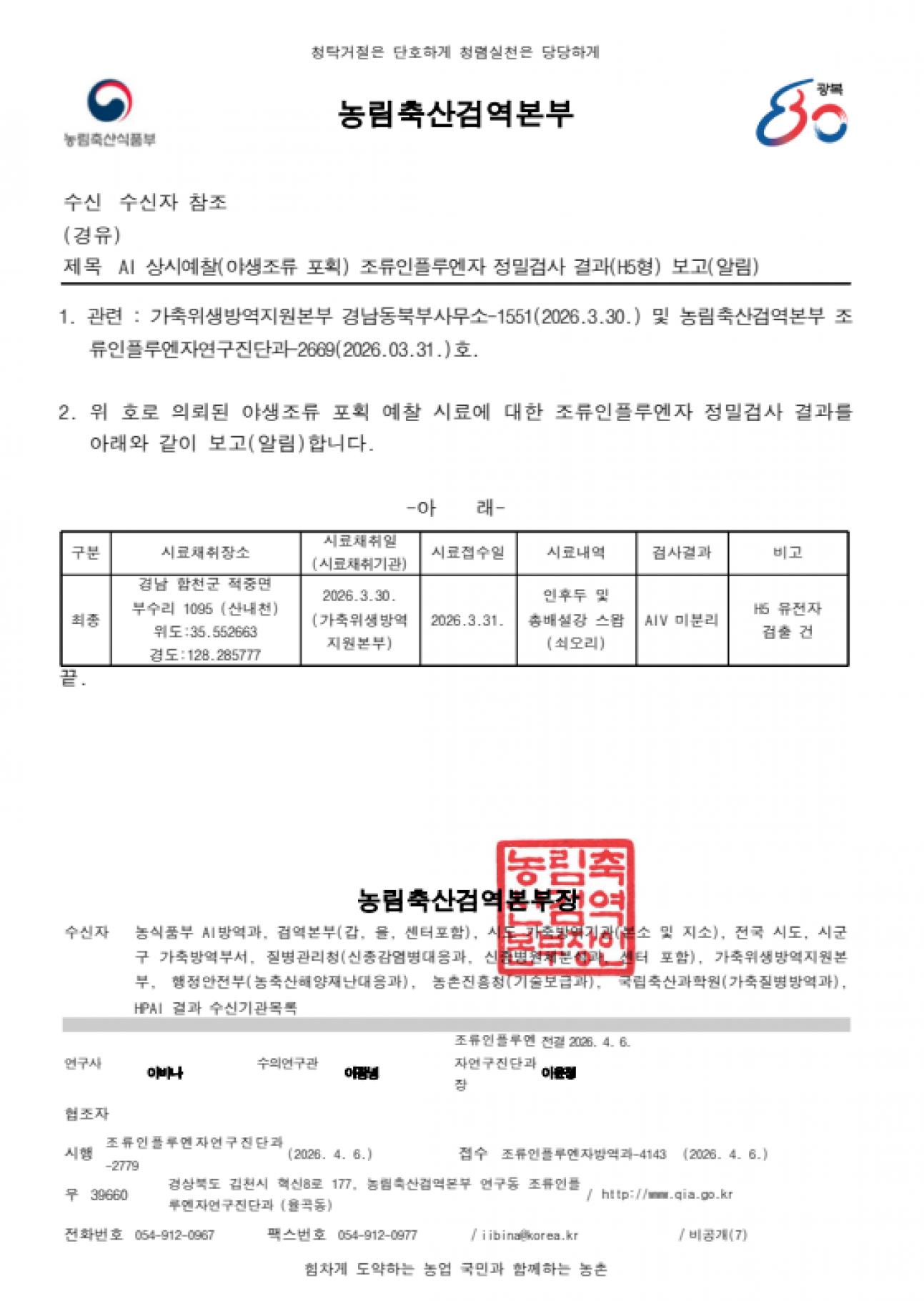 경남 합천군 소재 야생조류 AI 항원 미분리 지점 관리에 대한 후속조치 알림 |