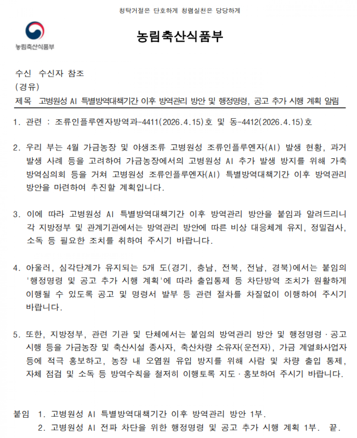 | 260414 AI 특방기간 후 방역관리 방안_송부용.hwpx 260414 고병원성 AI 전파 차단을 위한 행정명령 및 공고 추가 시행 계획_송부용.hwpx | |||