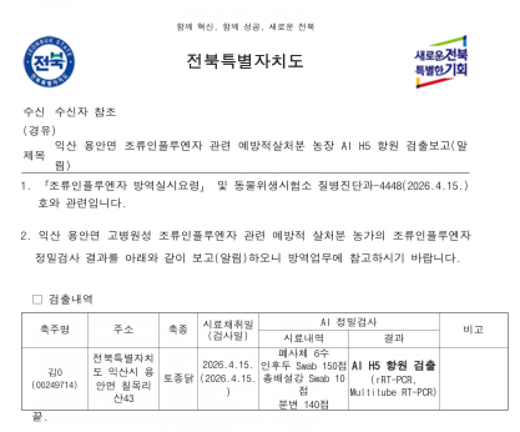 전북 익산 예방적 살처분 가금농장(토종닭) 고병원성 AI 의사환축 발생에 따른 방역강화 조치 |