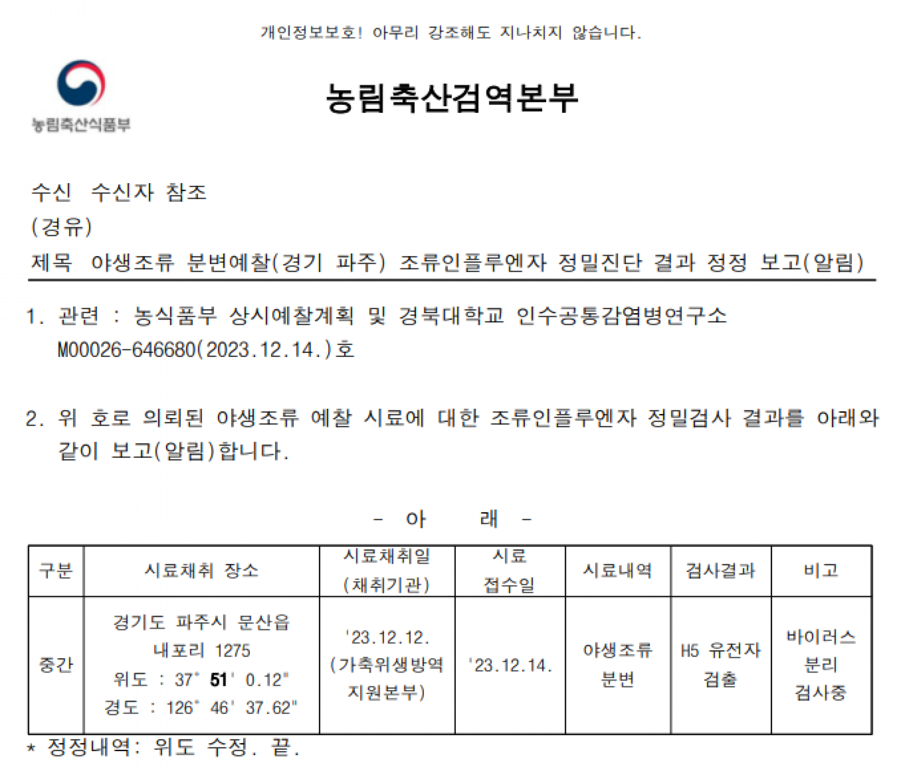 (경기 파주)야생조류 H5형 조류인플루엔자(AI) 항원 검출에 따른 차단방역 및 예찰 강화 알림
