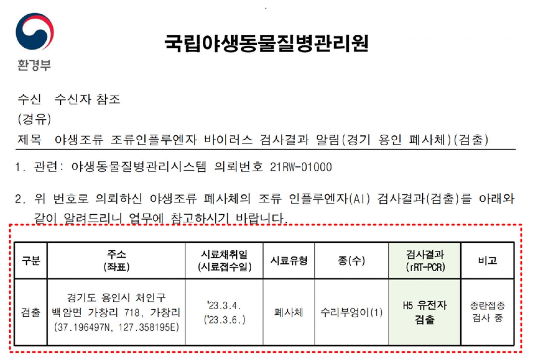 | [본문] 야생조류 H5형 조류인플루엔자(AI) 항원 검출에 따른 차단방역 및 예찰 강화 알림.pdf 야생조류 조류인플루엔자 바이러스 검사결과 알림(경기 용인 폐사체)(검출).pdf | |||