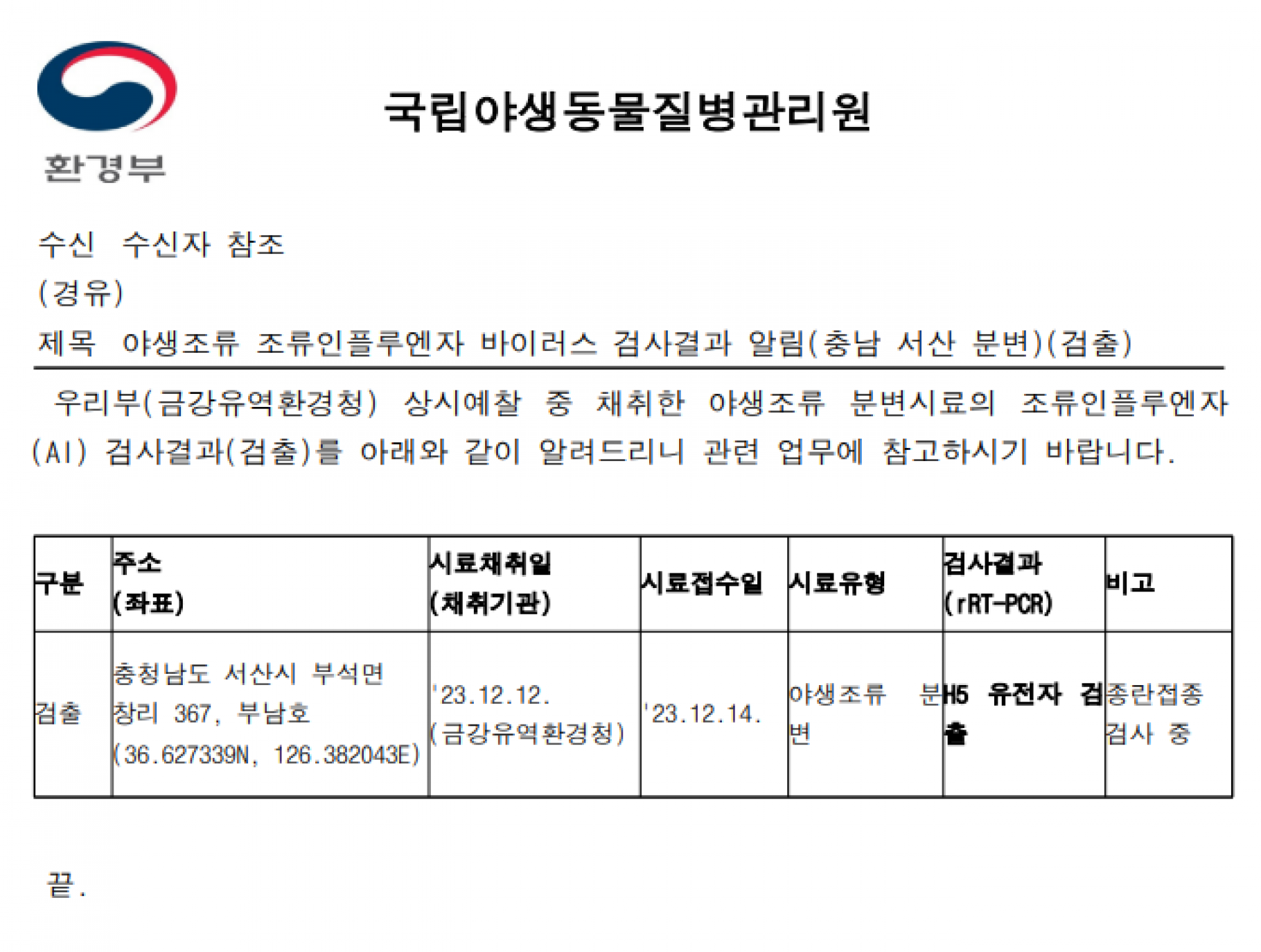 (충남 서산) 야생조류 H5형 조류인플루엔자(AI) 항원 검출에 따른 차단방역 및 예찰 강화 알림