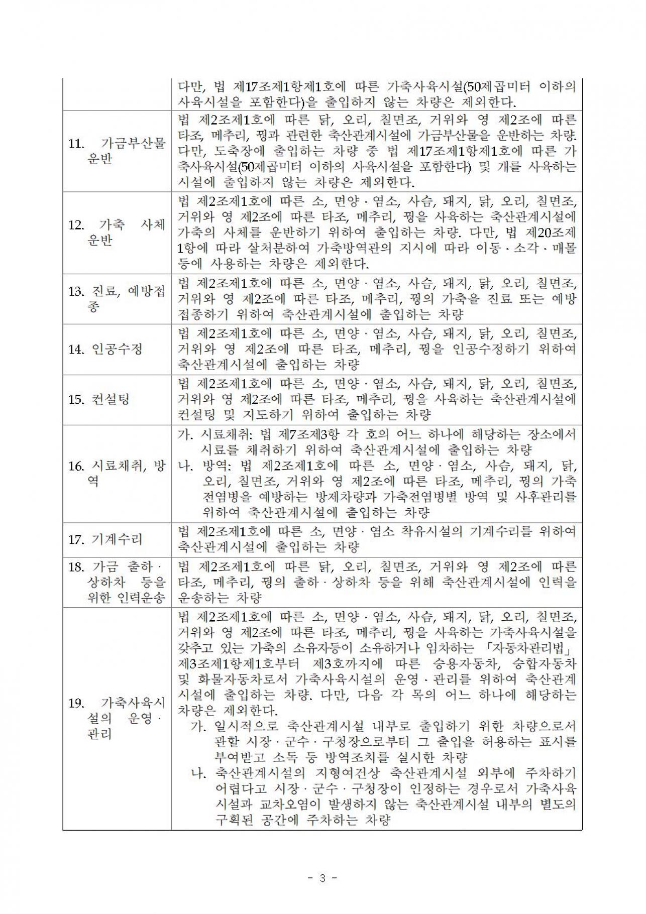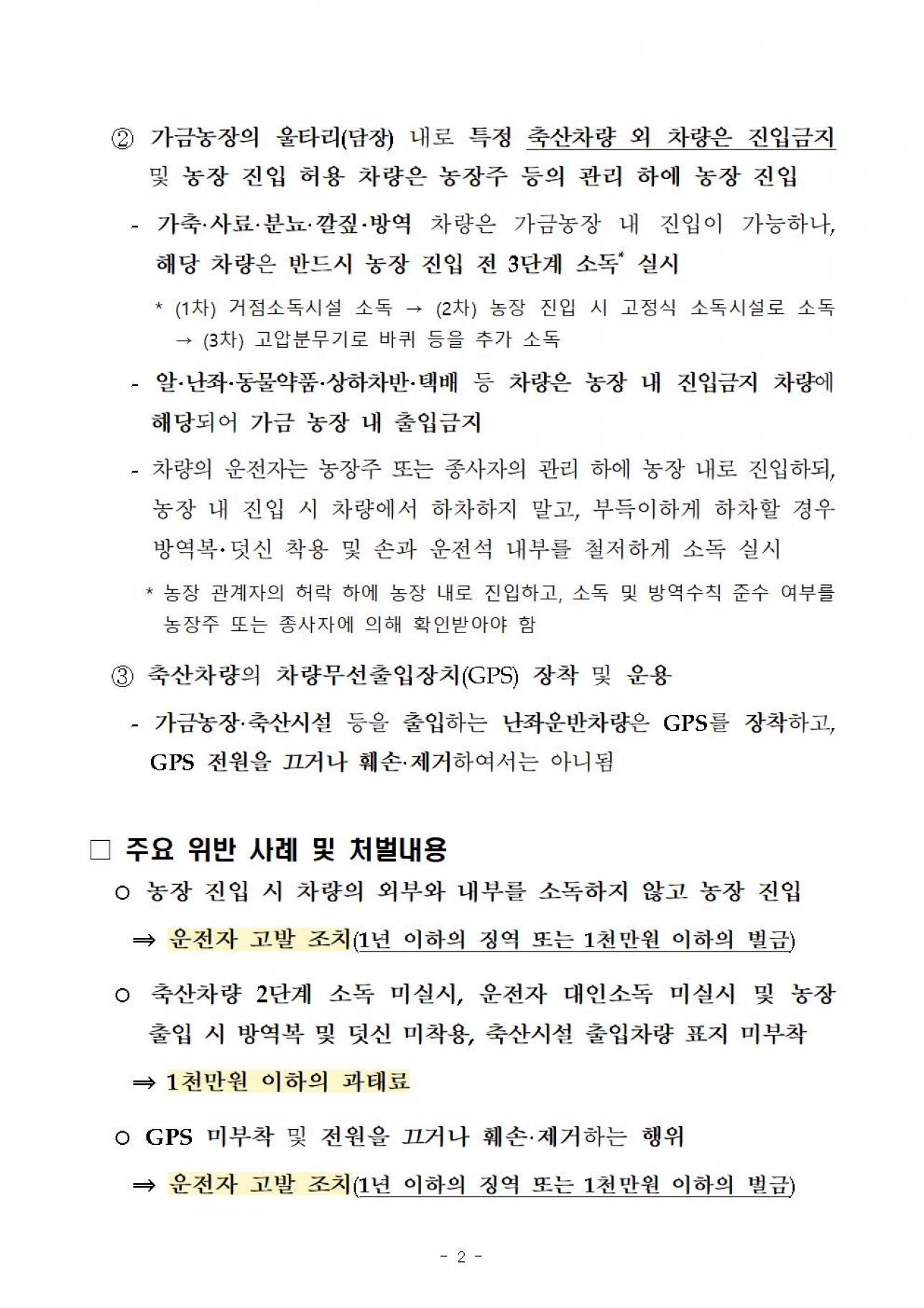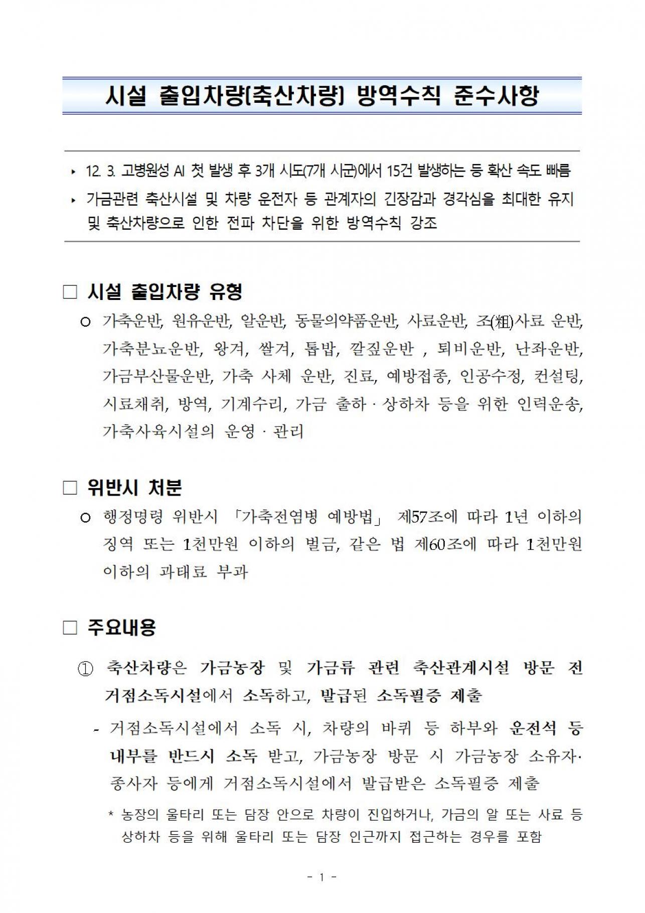 이번 겨울 고병원성 조류인플루엔자는 지난 12.3. 육용오리 농장에서 첫 발생 후 3개 시도(7개 시군)에서 15건이 발생하는 등 빠르게 확산되고 있습니다. 발생 농장에 대한 역학조사 결과 및 일시 이동중지 명령 이행결과 등 방역조치와 관련이 있는 경우 축산농장, 축산관계시설 및 차량에 대한 이동제한, 청소 세척 소독 건조, 검사, 일제소독 등 방역조치가 필요하며, 일부 도축장 및 사료공장이 폐쇄되는 사례도 발생한 바 있습니다. 이에, 가금 관련 축산관계자의 긴장감과 경각심을 최대한 유지하고 축산차량으로 인한 전파를 차단하기 위한 방역수칙을 강조하여 알려드리니 농가에서는 붙임파일을 확인하시어 준수하여주시기 바랍니다. ![]() ![]() ![]() ![]() ![]() ![]() ![]()