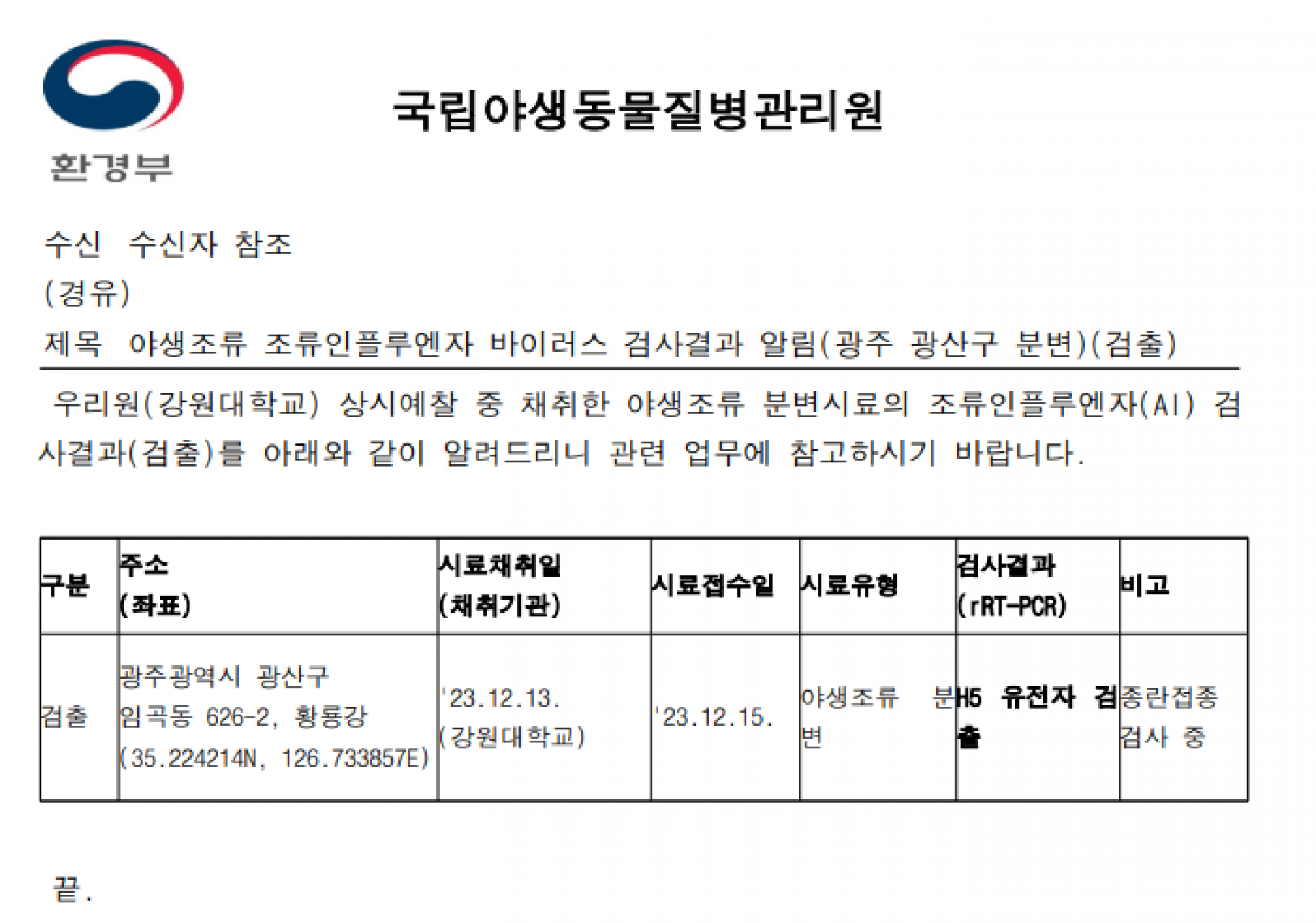 (광주 광산)야생조류 H5형 조류인플루엔자(AI) 항원 검출에 따른 차단방역 및 예찰 강화 알림