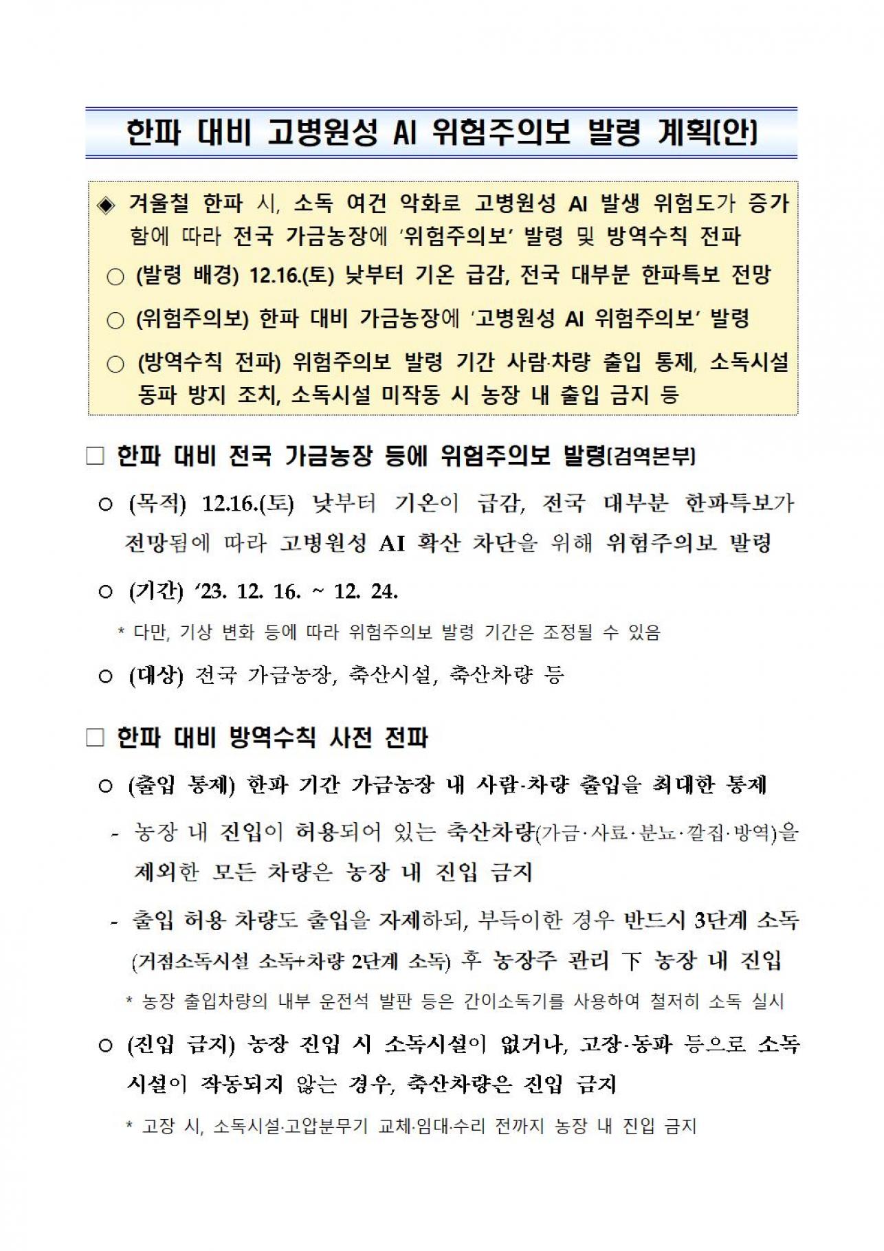 | 231216 한파 대비 고병원성 AI 위험주의보 발령 계획.hwp | |||