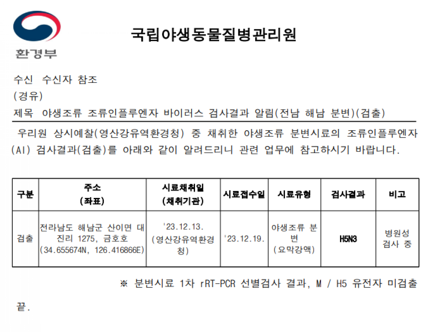 야생조류 H5N3형 조류인플루엔자(AI) 항원 검출에 따른 차단방역 및 예찰 강화 알림