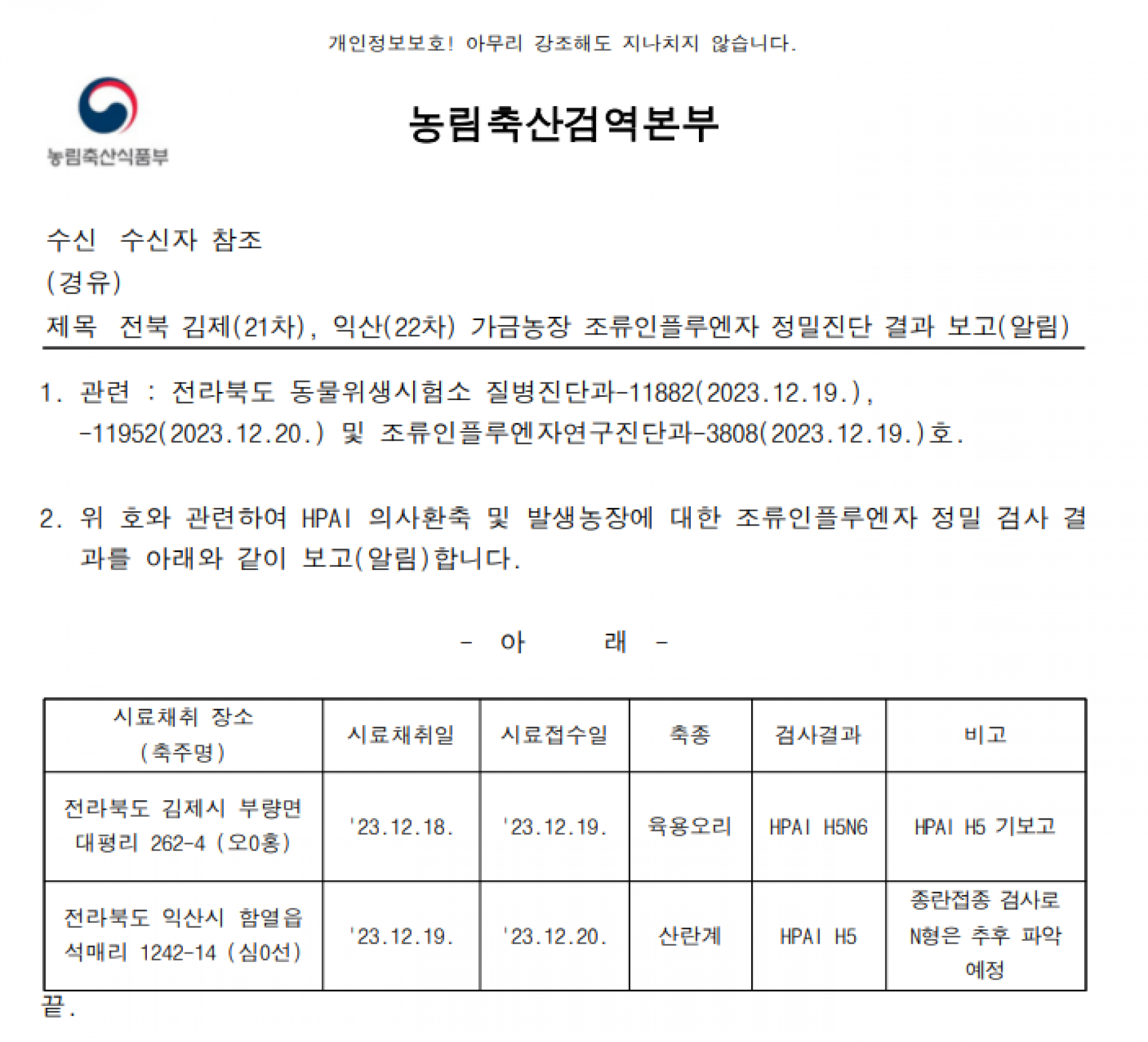 전북 익산시(22차) 가금농가(산란계)고병원성 AI 확진에 따른 방역조치 알림