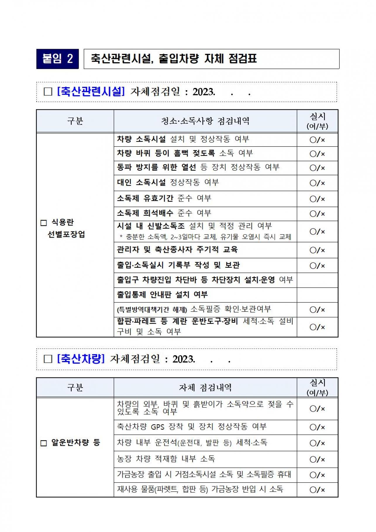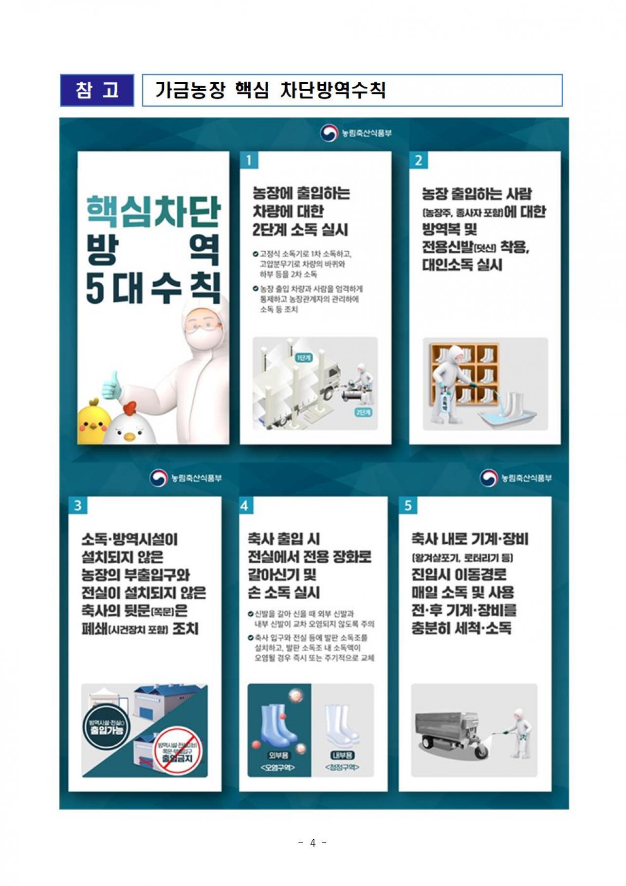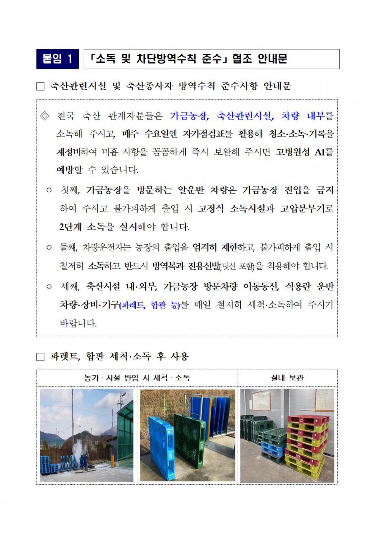 최근 김제, 아산, 익산의 산란계 농장에서 고병원성 조류인플루엔자(AI)가 연달아 확진됨에 따라 농장, 식용란 선별 포장업소 등 식용란 운반과정에서 교차 오염 방지 등에 대한 철저한 차단방역이 필요한 상황입니다. 이에 농가에서는 붙임파일을 참고하시어 가금농장, 식용란 선별포장업체, 알 운반 차량 등에서 교차오염이 발생하지 않도록 가금농장 출입 시 핵심방역수칙 준수 및 파레트, 합판 등 재사용물품에 대한 철저한 세척 · 소독을 준수하여주시기 바랍니다.![]() ![]() ![]() 심방역수칙 준수 및