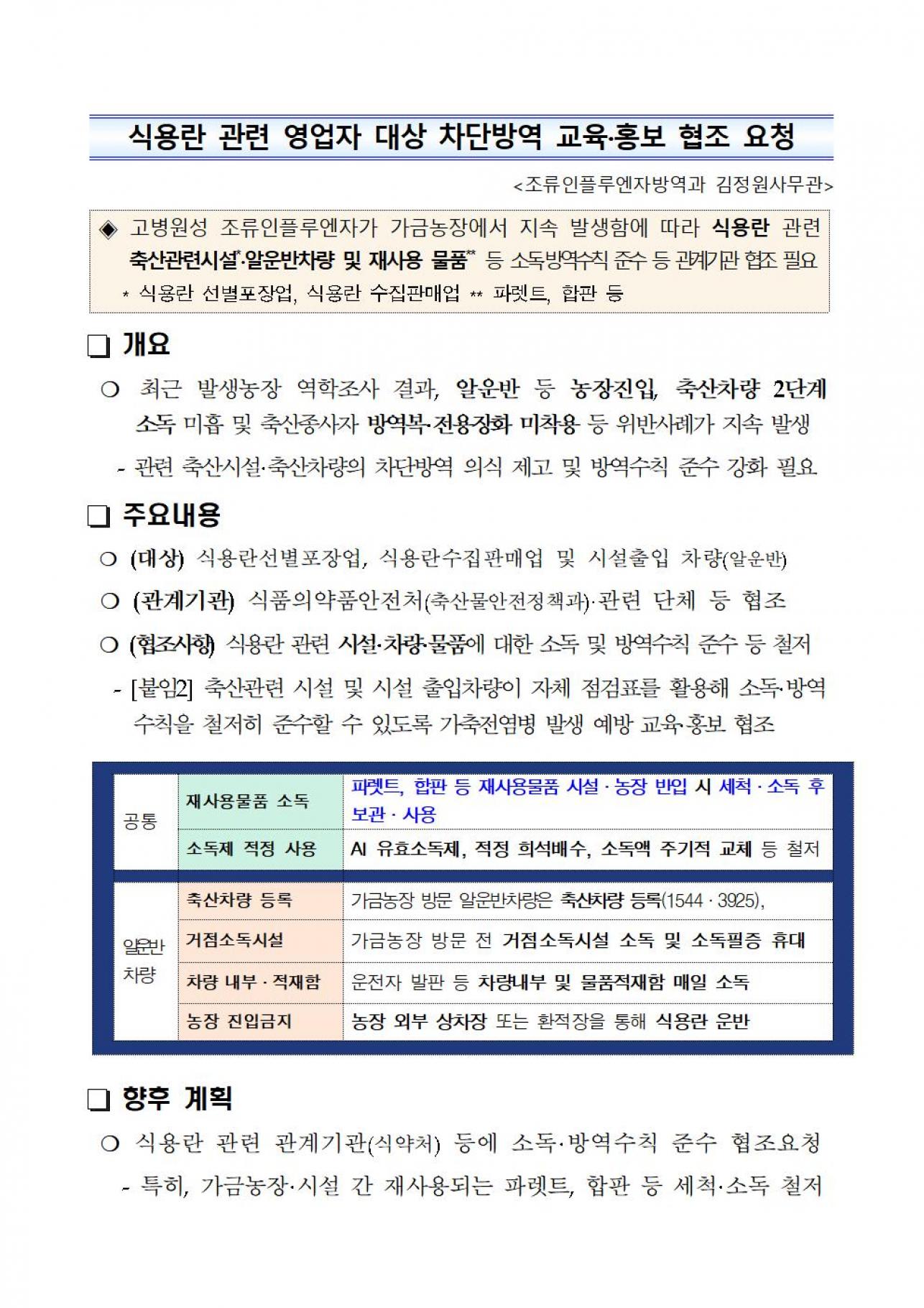 식용란 관련 영업자 대상 가축전염병 발생 예방 교육 및 홍보 협조 |