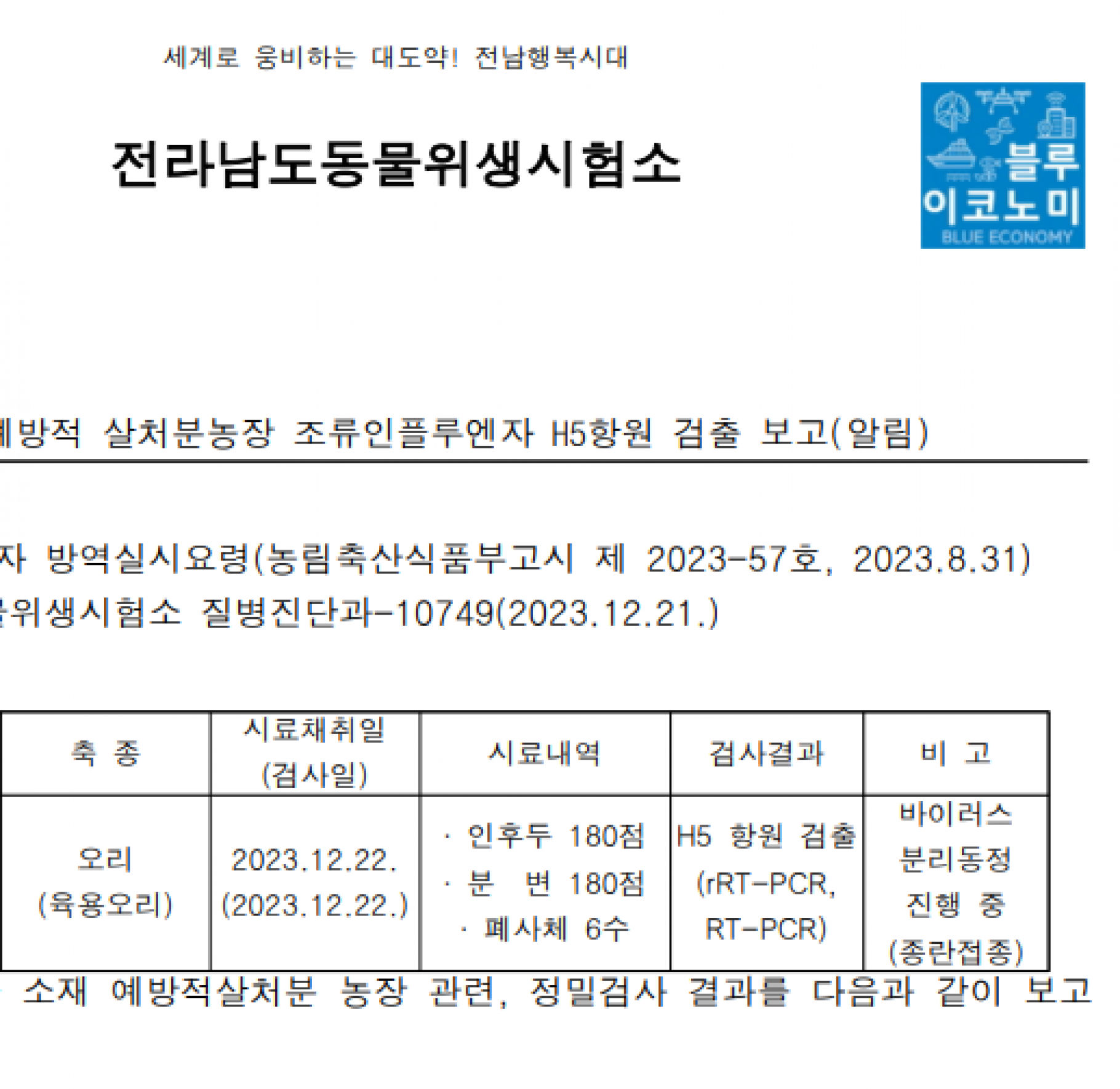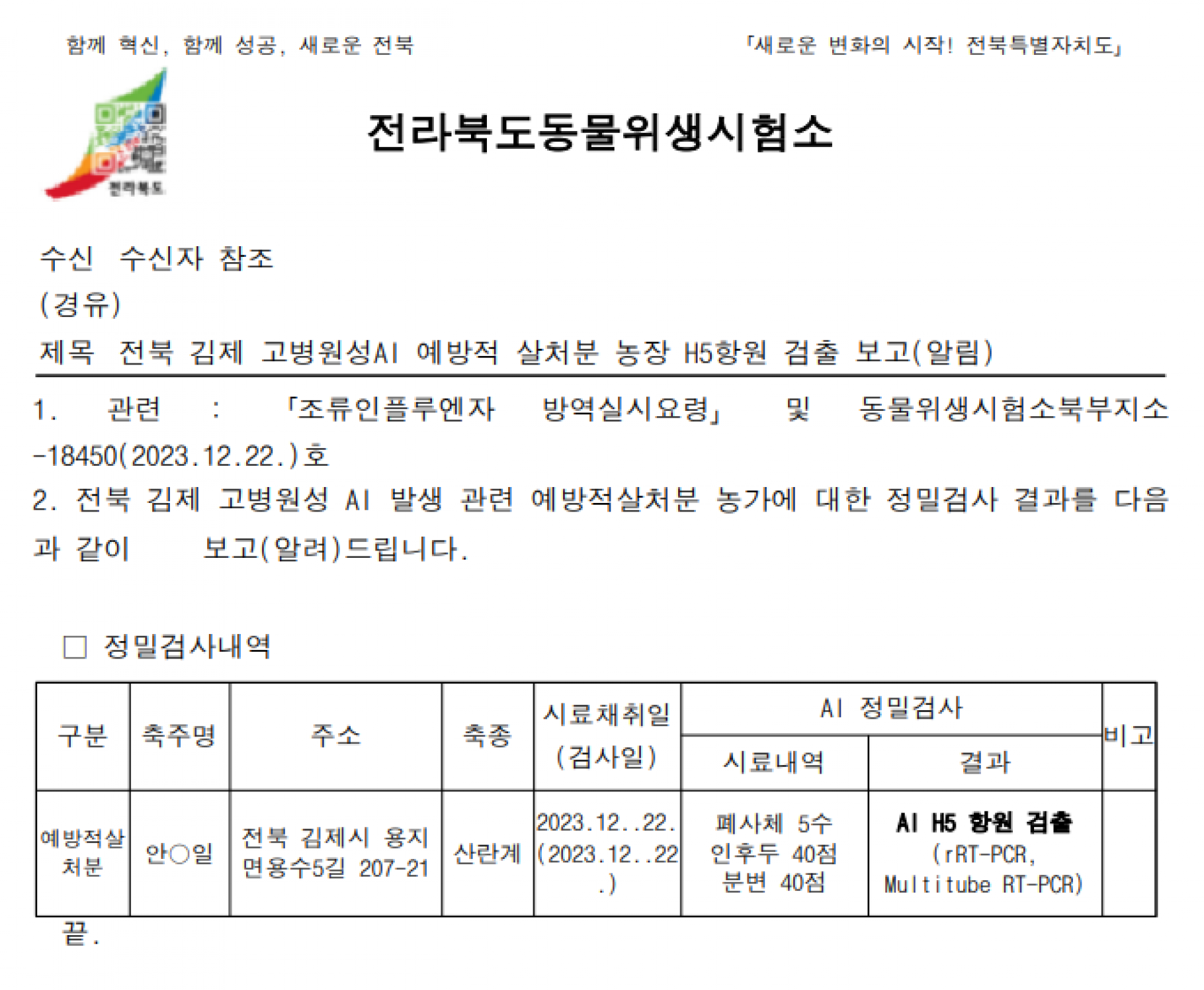 전북 김제 및 전남 장흥 가금농장 고병원성 AI 의사환축 발생에 따른 방역강화 조치 |