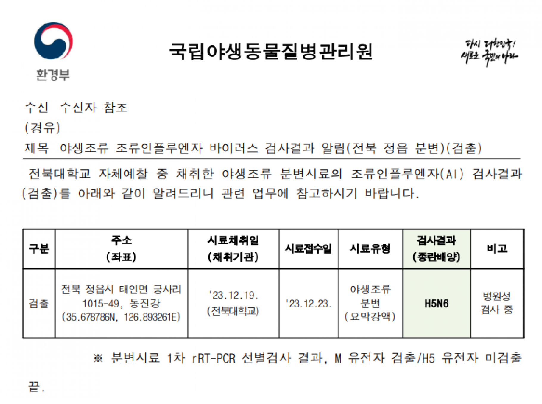 (전북 정읍)야생조류 H5형 조류인플루엔자(AI) 항원 검출에 따른 차단방역 및 예찰 강화 알림