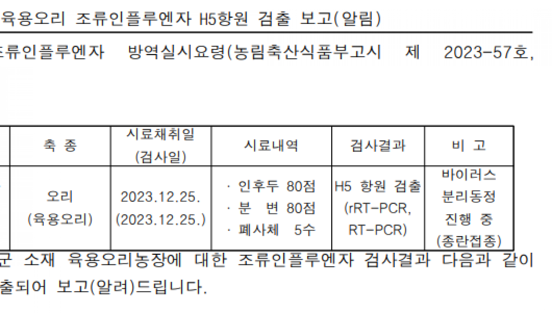 전남 보성 가금농장(육용오리) 고병원성 AI 의사환축 발생에 따른 방역강화 조치 |