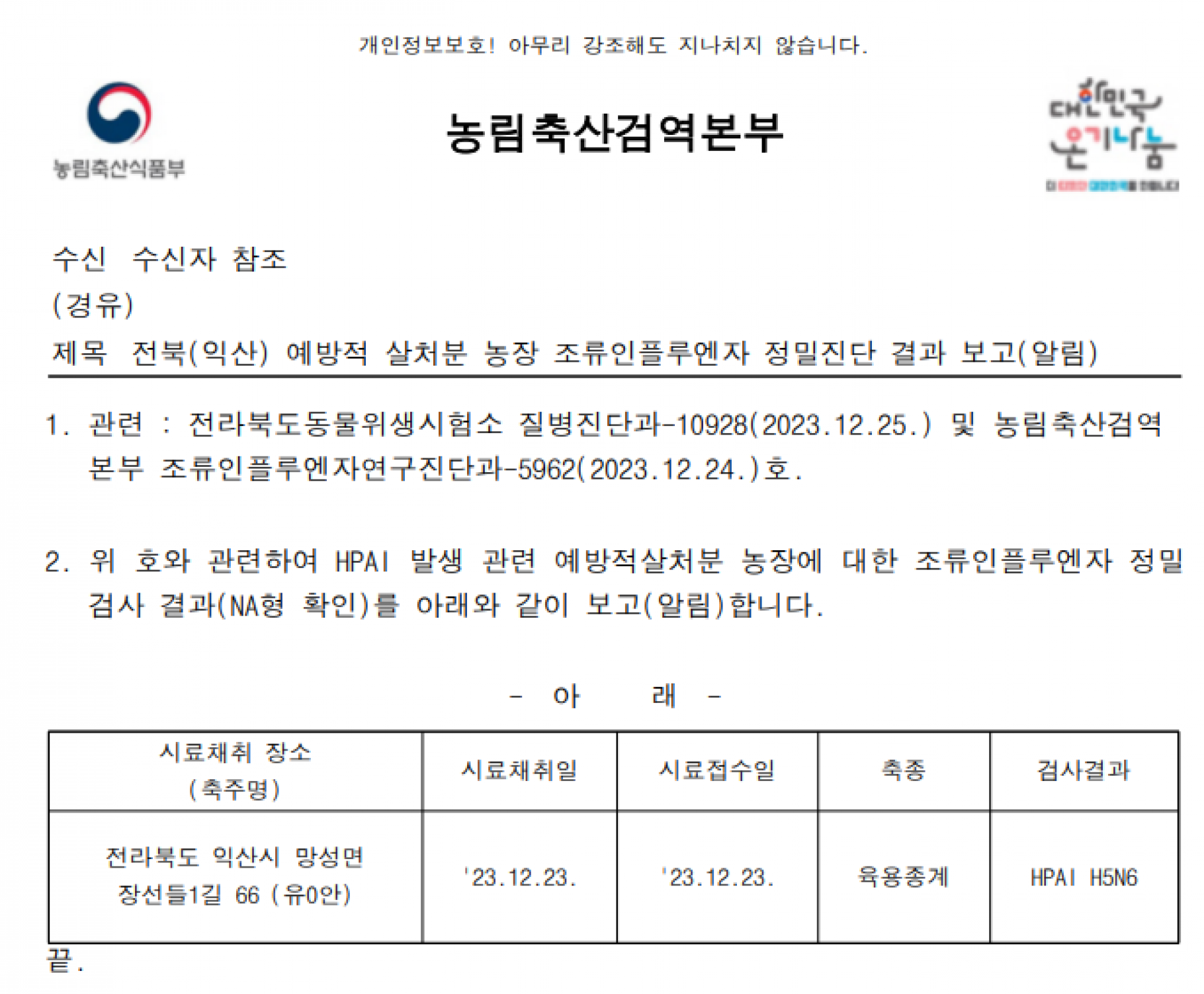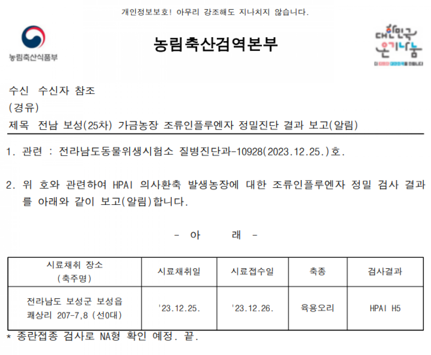 정부는 전남 보성 육용오리 농장(25차) 및 전북 익산 예방적 살처분 농장(육용종계)의 고병원성 AI 의사환축에 대한 정밀검사 결과, 고병원성 AI로 확진되어 방역조치 사항을 알려드리니 이행에 철저를 기하여 주시기 바랍니다.