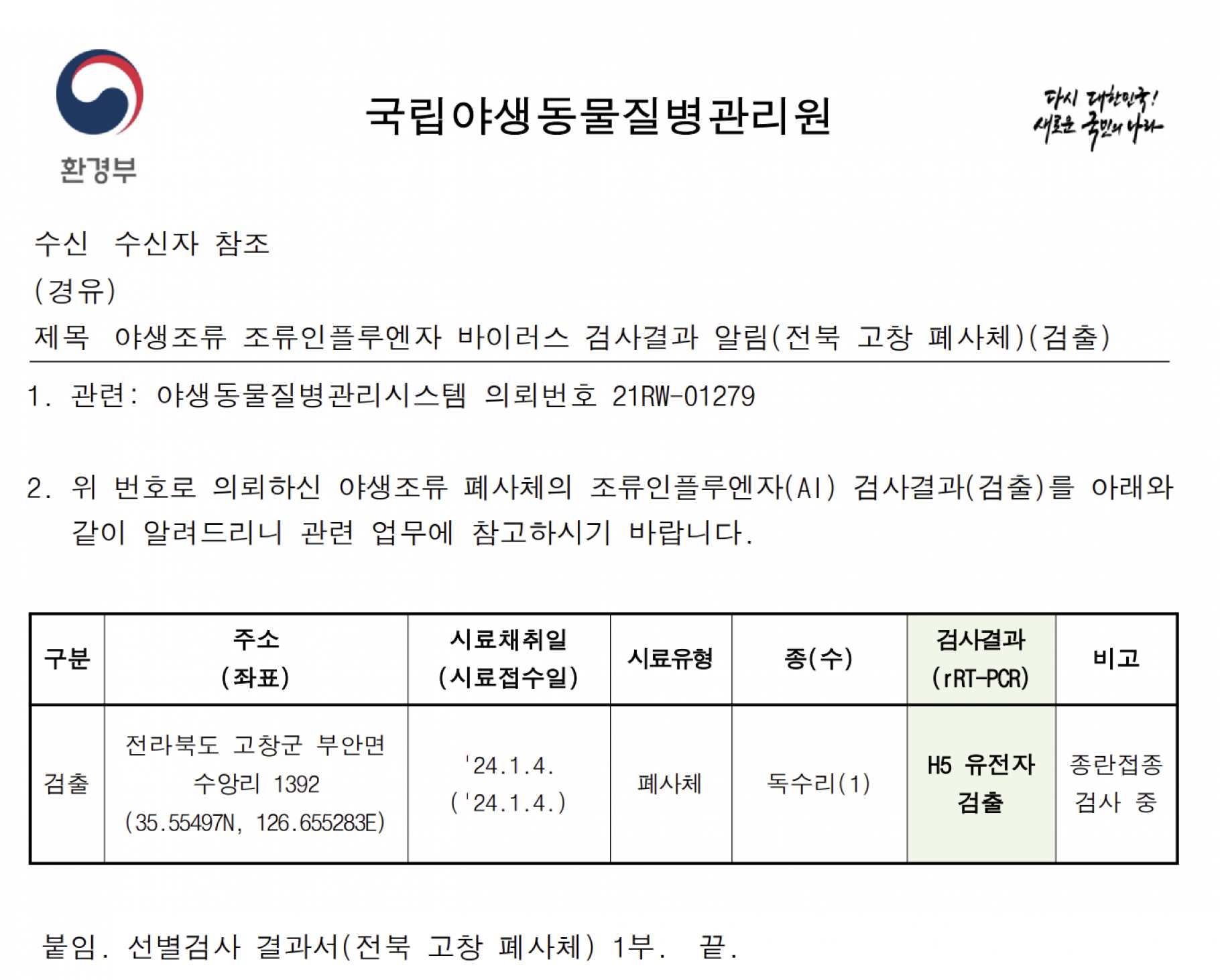 (전북 고창)야생조류 H5형 조류인플루엔자(AI) 항원 검출에 따른 차단방역 및 예찰 강화 알림
