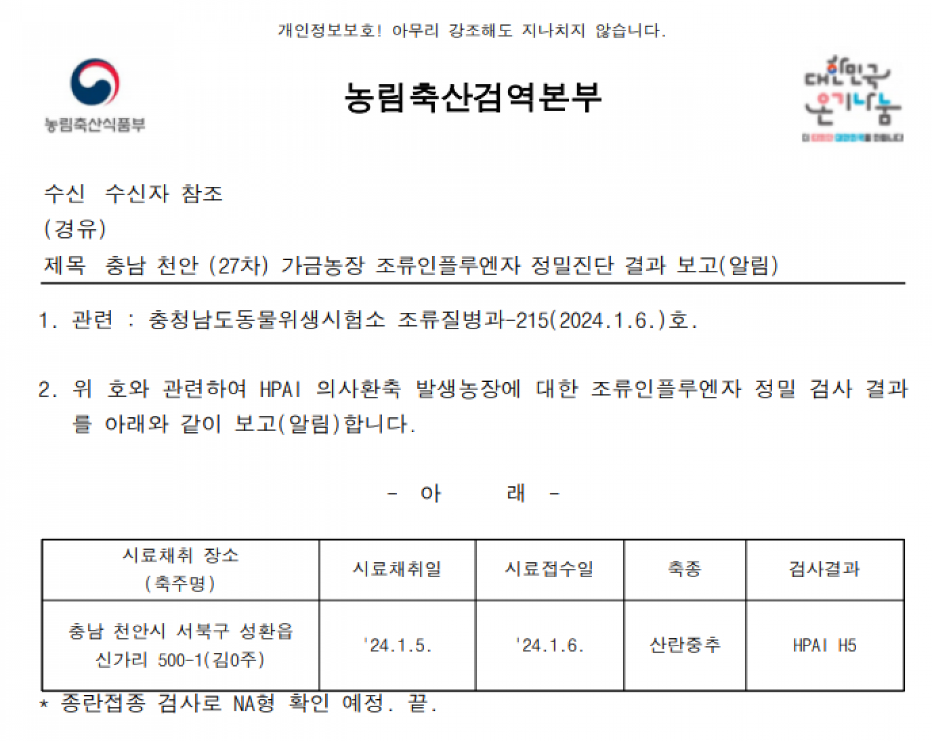 충남 천안 가금농장(산란계) 고병원성 AI 확진에 따른 방역조치 알림