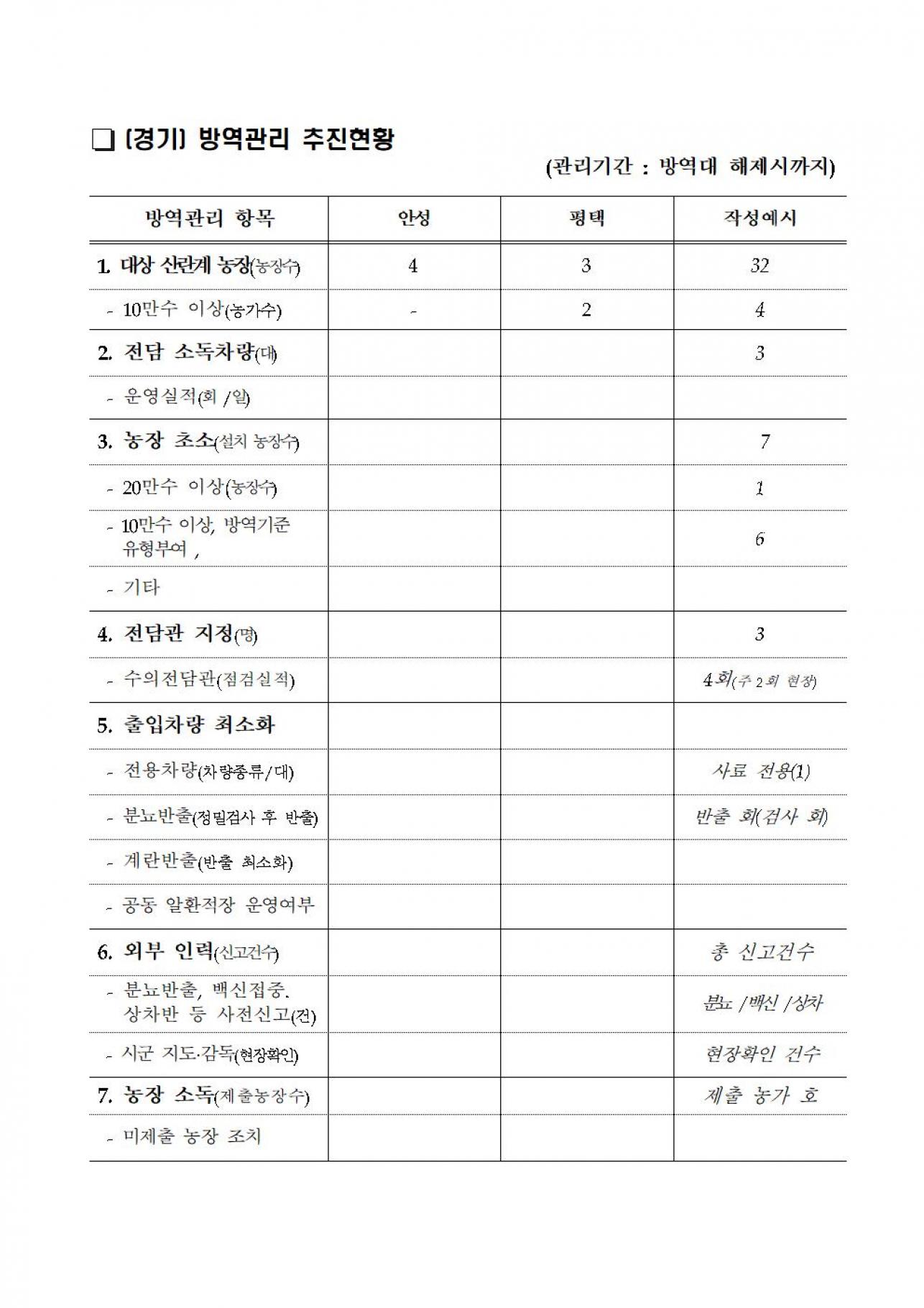 현재 발생농장 방역대 내 산란계 농장에 대한 방역관리가 추진 중에 있으나, 산란계 농장이 많은 충남 천안의 대규모 산란계(239천수) 농장에서 고병원성 AI H5형 항원이 검출됨에 따라 산란계 농장에 대한 강화된 방역관리가 필요한 상황입니다. 이에, 정부에서는 대규모 산란계(20만수 이상) 농장의 출입차량 간 중복 방문을 최소화 하기 위해 축산 차량 출입 최소화 방안을 포함한 강화된 방역대 내 산란계 농장 방역관리 추진 방안을 알려드리니, 농장에서는 붙임 파일을 확인하시어 농장에서는 참고하시기 바랍니다. ![]() ![]() ![]() ![]() ![]() ![]()