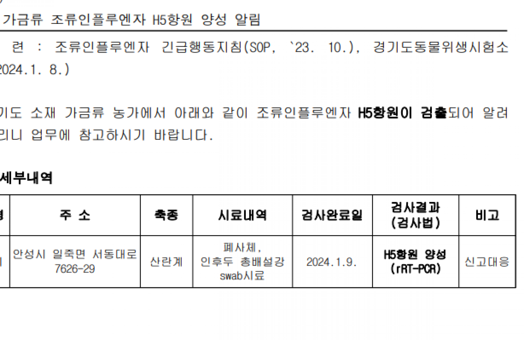 (경기 안성) 가금농장(산란계) 고병원성 AI 의사환축 발생에 따른 방역강화 조 |