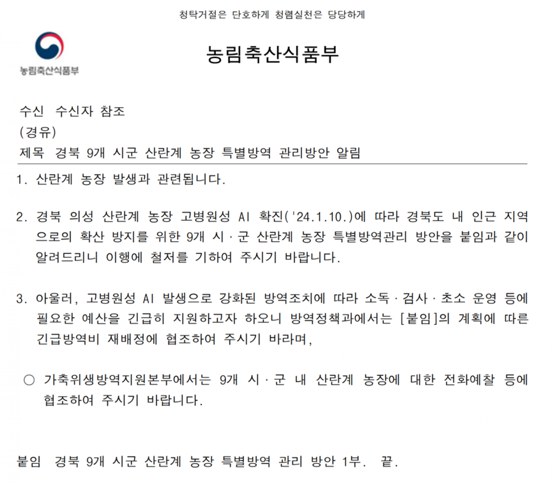 | (첨부)경북 9개 시군 산란계 농장 특별방역 관리방안.hwpx | |||