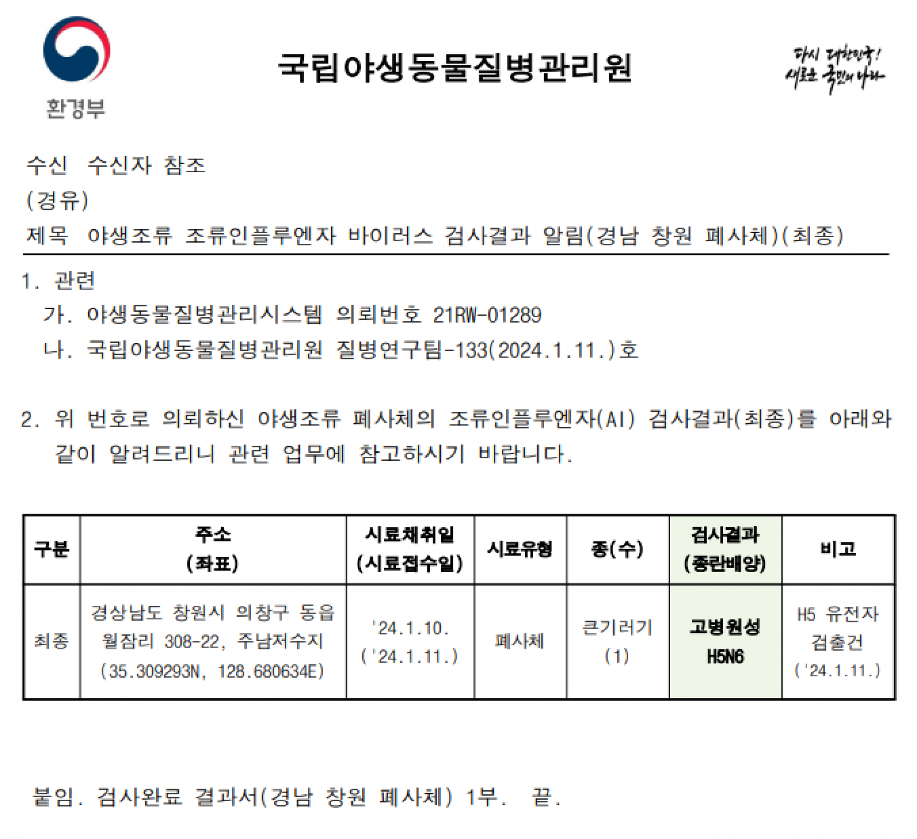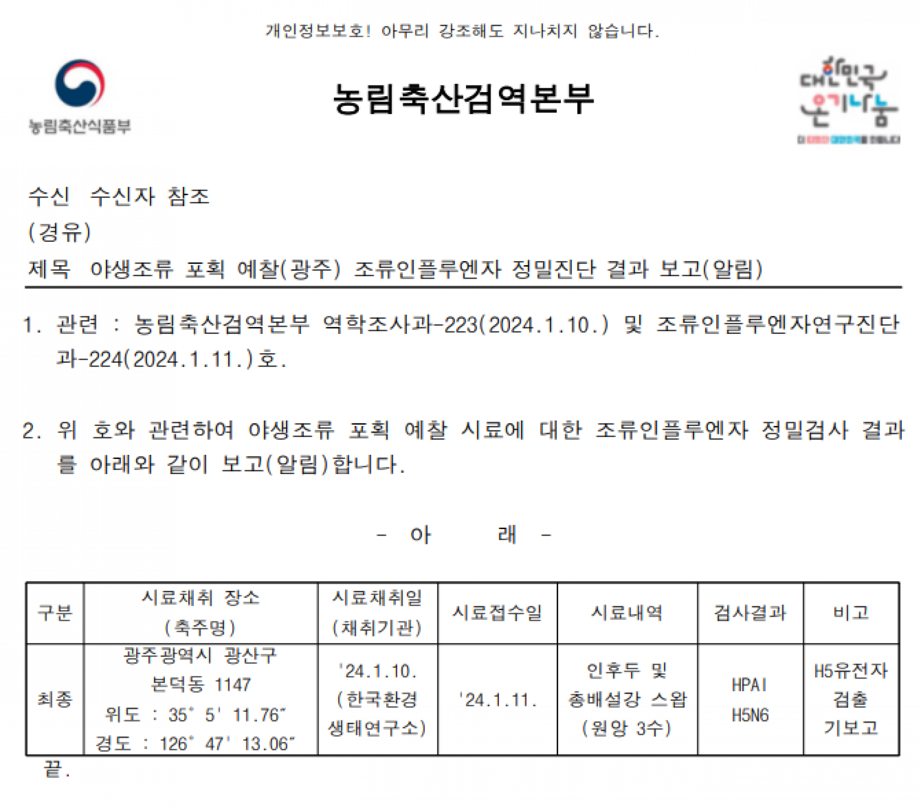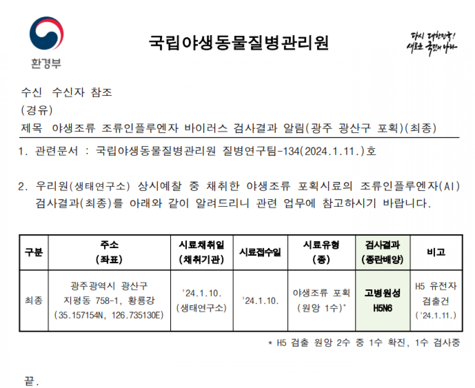 (광주 광산, 경남 창원) 야생조류 고병원성 조류인플루엔자(H5N6형) 검출에 따른 차단방역 강화 알림
